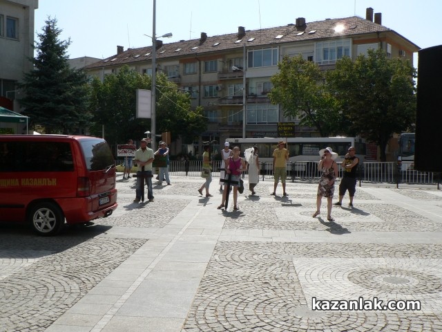 Работещите в Театър „Любомир Кабакчиев“ и днес излязоха на пореден протест пред Община Казанлък. Днес театралите протестираха и срещу проекто - решенията, които ще бъдат разглеждани от Общинския съвет в сряда. Според проекта за решения на ОбС се планира и намаляване на числеността на работещите в Театъра, като броя на щатните служители ще бъде променен от 44 на максимум 30 души. Протеста отново бе проведен със аудио уредба, но минути след започването му полицейски служители се опитаха да прекъснат митинга. Въпреки думите на полицаите, театралите не се съгласиха и останаха на площада пред сградата на общината. В последствие униформените не позволиха използването на звукова техника и оставиха протестиращите да завършат протеста, който бе обявен от 16,30 до 17,30. На няколко пъти протестиращите успяваха да пуснат агрегата и да вземат микрофона, но бързо полицаите спираха уредбата.