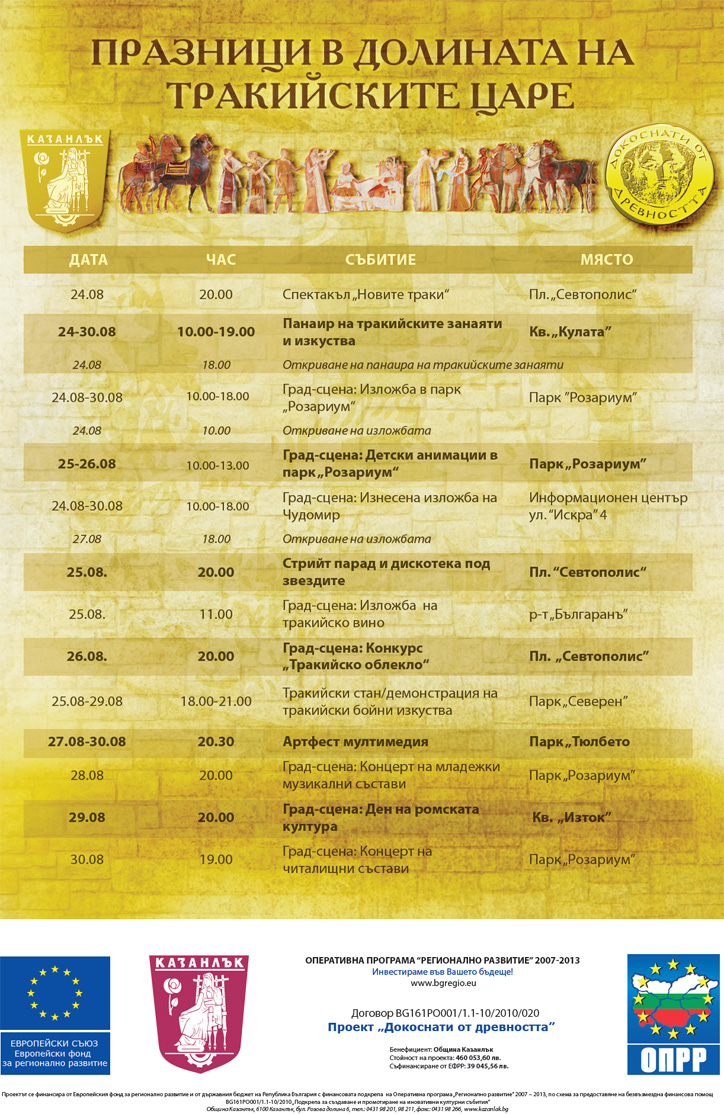 Готова е програмата за Празниците в Долината на тракийските царе. От днес тя е качена на официални сайт на Община Казанлък: www.kazanlak.bg