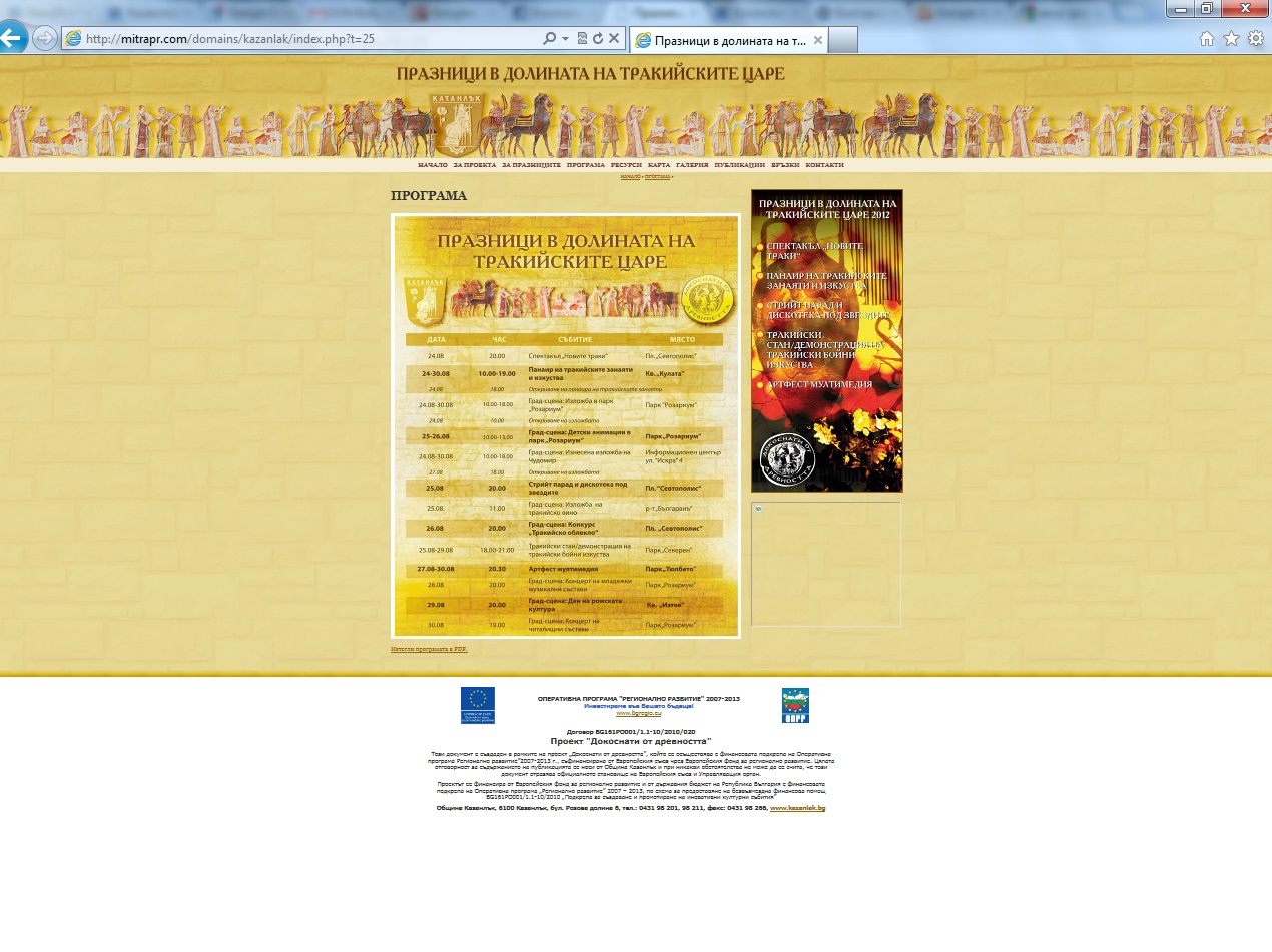 www.dokosnatiotdrevnostta.eu е адресът, от който България ще научи за Празниците в долината на тракийските царе, които стартират идния петък в Казанлък. МИТРА-ПР е фирмата поддържаща този сайт - става ясно от каченитев самия сайт pdf брошури.