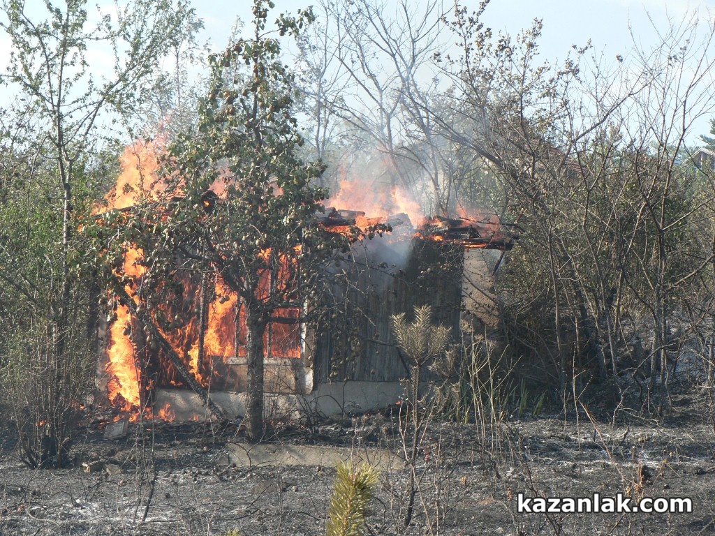 Първия пожар е възникнал в местността „Голяма гюрля” на язовир Копринка, като там горят треви и храсти, а служителите на казанлъшката пожарна се опитват да предотвратят запалването на близката борова гора.