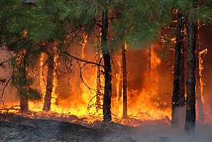 Първия пожар е възникнал в местността „Голяма гюрля” на язовир Копринка, като там горят треви и храсти, а служителите на казанлъшката пожарна се опитват да предотвратят запалването на близката борова гора.