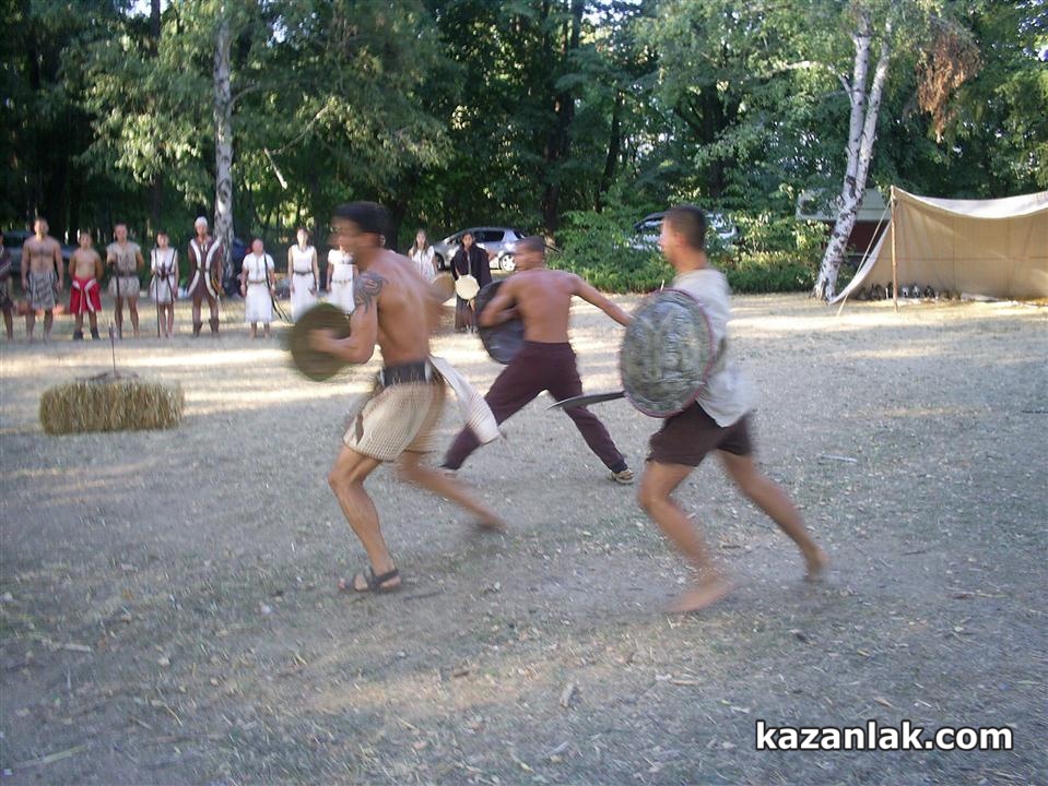 Разположеният край колодрума Тракийски стан, включен в Програмата на Празниците в Долината на тракийските царе събра стотици казанлъчани в последния ден от представянето си снощи. Бойците - мъже и жени от прабългарска школа Баг-Тур цяла седмица представят пред публика тракийски бойни умения, разказват с внимание на всеки посетител за тракйските и прабългарски оръжия и въоръжение и обучават деца и възрастни в стрелба с лък, бой с бичове, мечове, копия и тояги и разхождат казанлъшките деца на кон - изцяло безплатно.