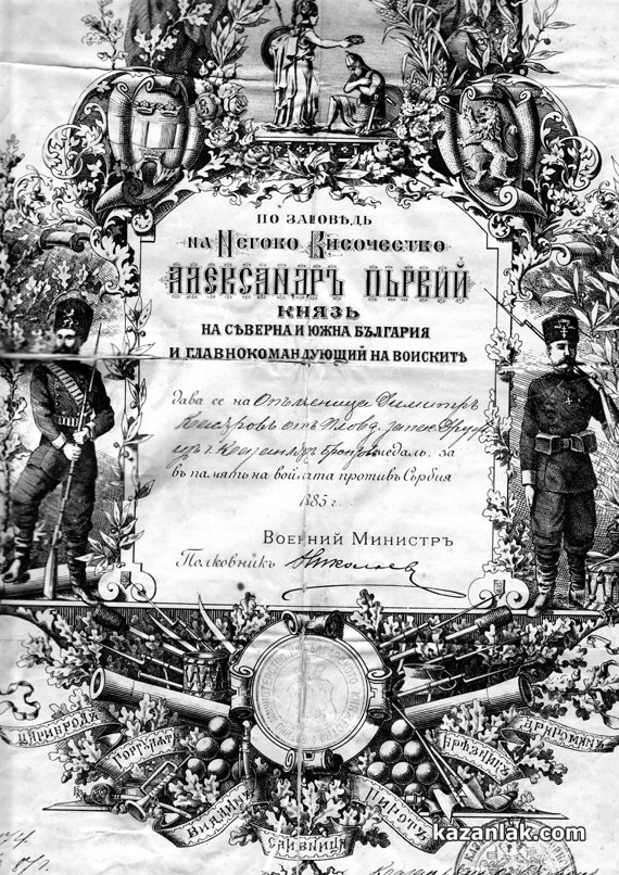 Снимка:Заповед на княз Александър Батенберг за награждаването на опълченеца Димитър Касъров с бронзов медал в памет на войната против Сърбия/Исторически Музей "Искра"/