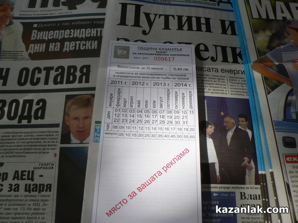 От вестникарските сергии в Казанлък вече могат да се закупят талони за кратковременно паркиране. Павилионите, в които се предлагат талоните са обозначени със стикери с емблемата на Община Казанлък. Засега се продават образци за 30 минутно паркиране на стойност 0,40 лева, като на тях трябва да се отбележи датата, часа и минутата на паркиране на МПС-то. Този тип талони бяха използвани и миналата година и на тях са отбелязани улиците от т.нар. Синя зона, действащи в началото на годината.