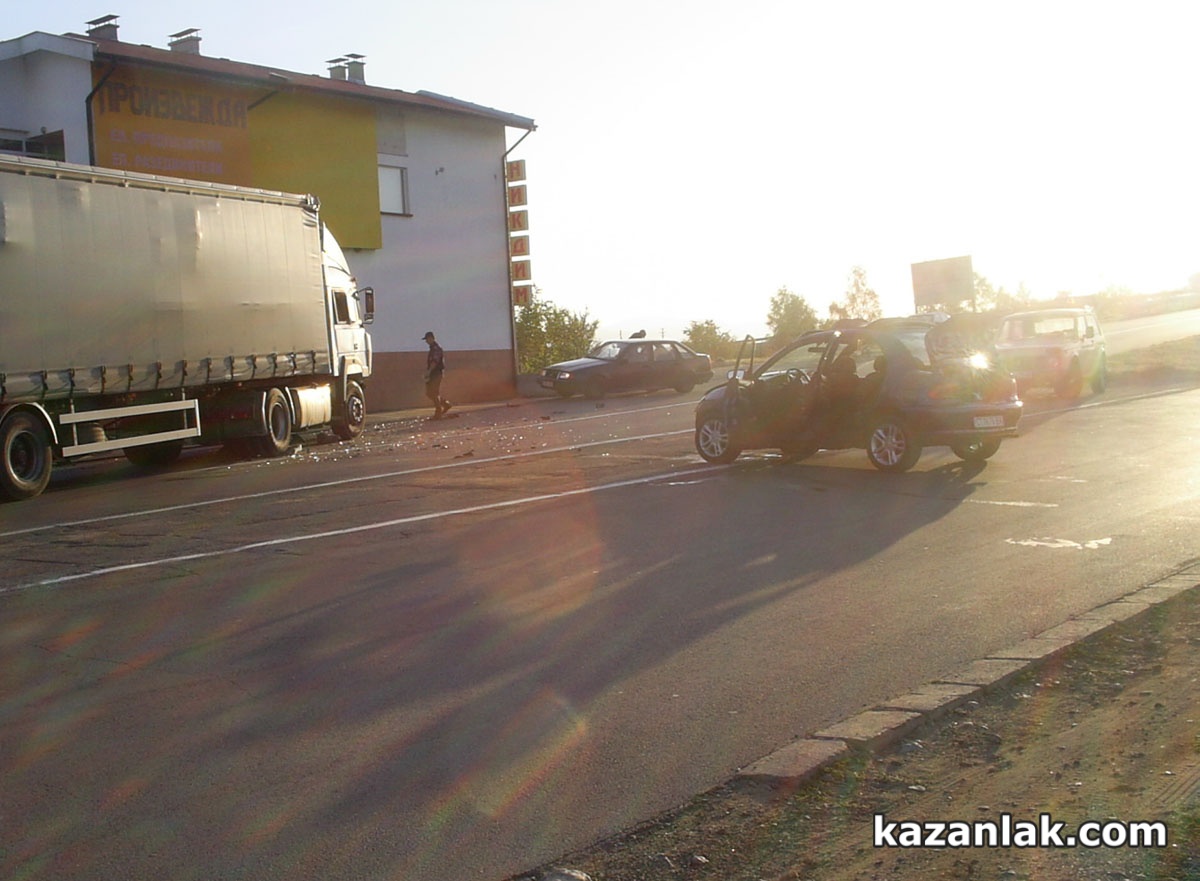 Последиците от инцидента, станал около 18:00 тази вечер все още са на мястото на катастрофата и автомобилите продължават да заобилакят Ивекото и Маздата. По думите на шофьорката на леката кола, товарният камион буквално я е връхлетял, докато тя се опитвала да го изчака да премине, за да се включи в движението.