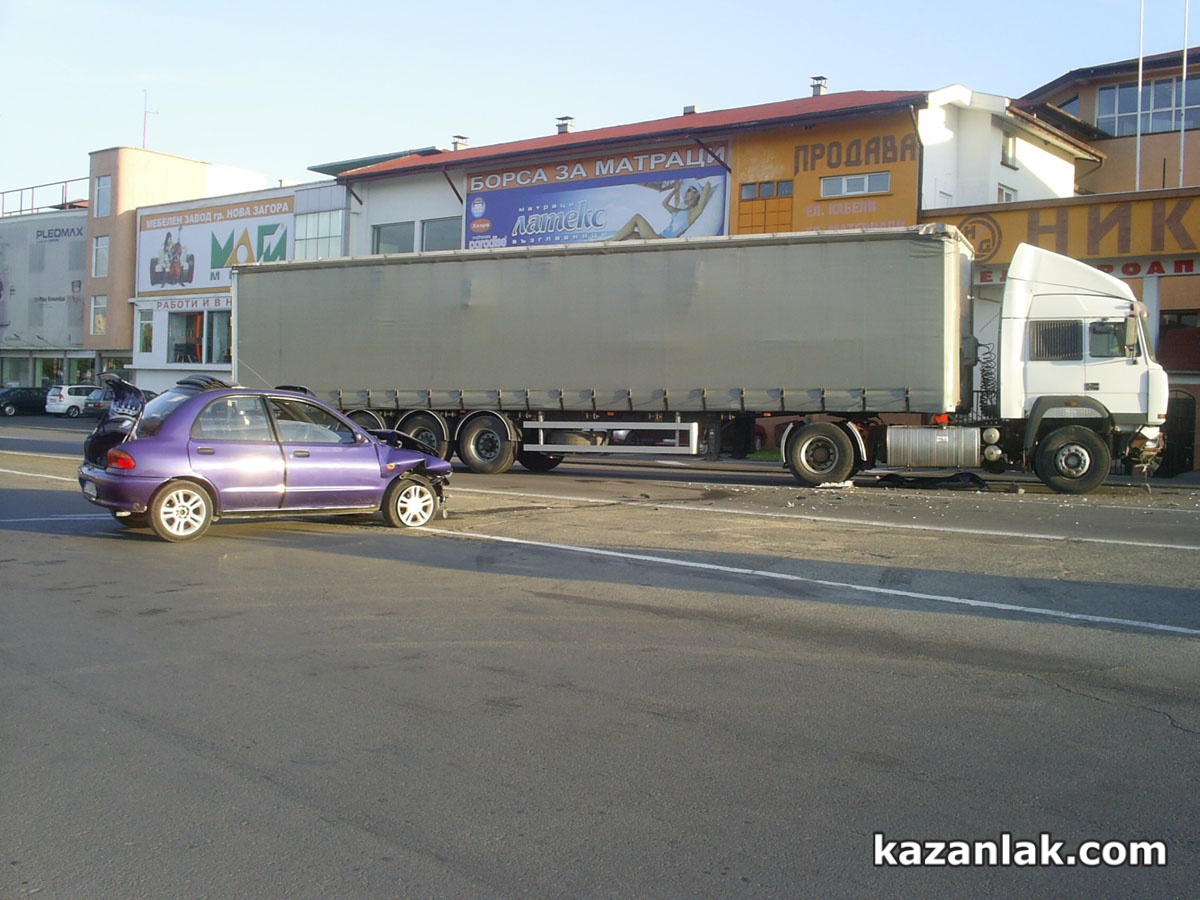 Според описанието, което направи пред наш репортер младата жена, тя била отстрани на банкета и се опитала да се включи в движението, за да обърне наляво и се върне към града. Но спряла на "островчето" за да изчака идващия от града в посока към надлеза за КАТ тежък камион. Но Ивекото не подминало, а направо налетяло на малката Мазда и минало почти през капака й, за късмет без да нарани жената в колата, обясни тя. Щетите са повече, разбираемо - по Маздата, целият булевард е в стъкла.