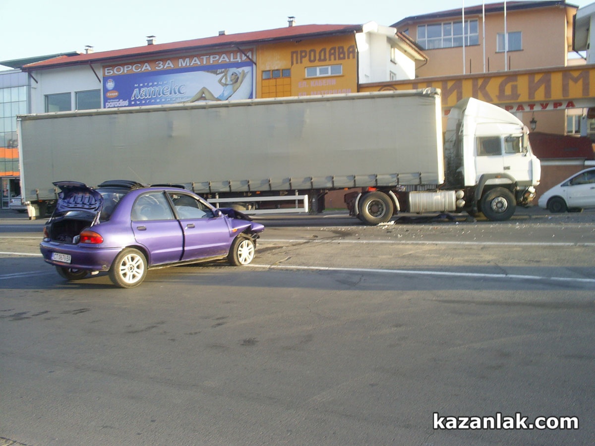 "На булевард в Казанлък лек автомобил „Мазда” с водач 26-годишната К.П. от същия град се блъснал в товарно „Ивеко”, управлявано от старозагорецът И.И.-31г. за радост в резултат на това няма пострадали хора, но са нанесени материални щети и по двете возила."