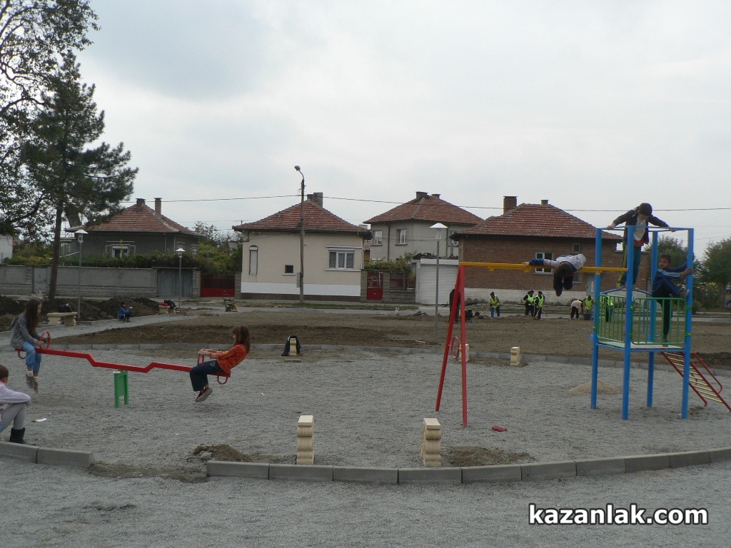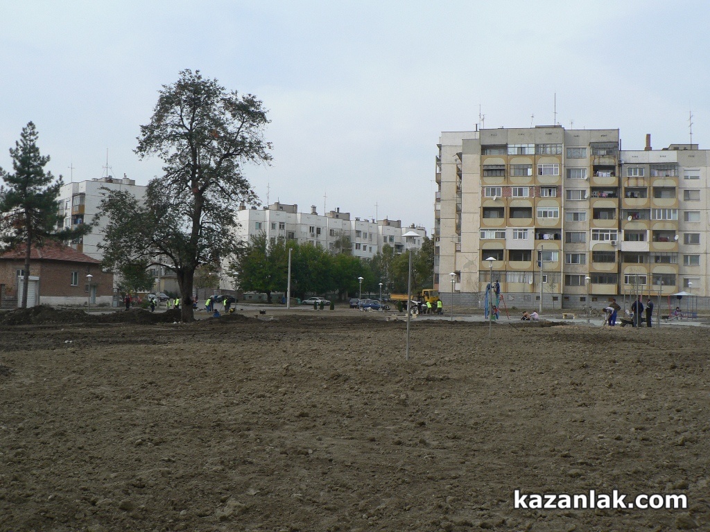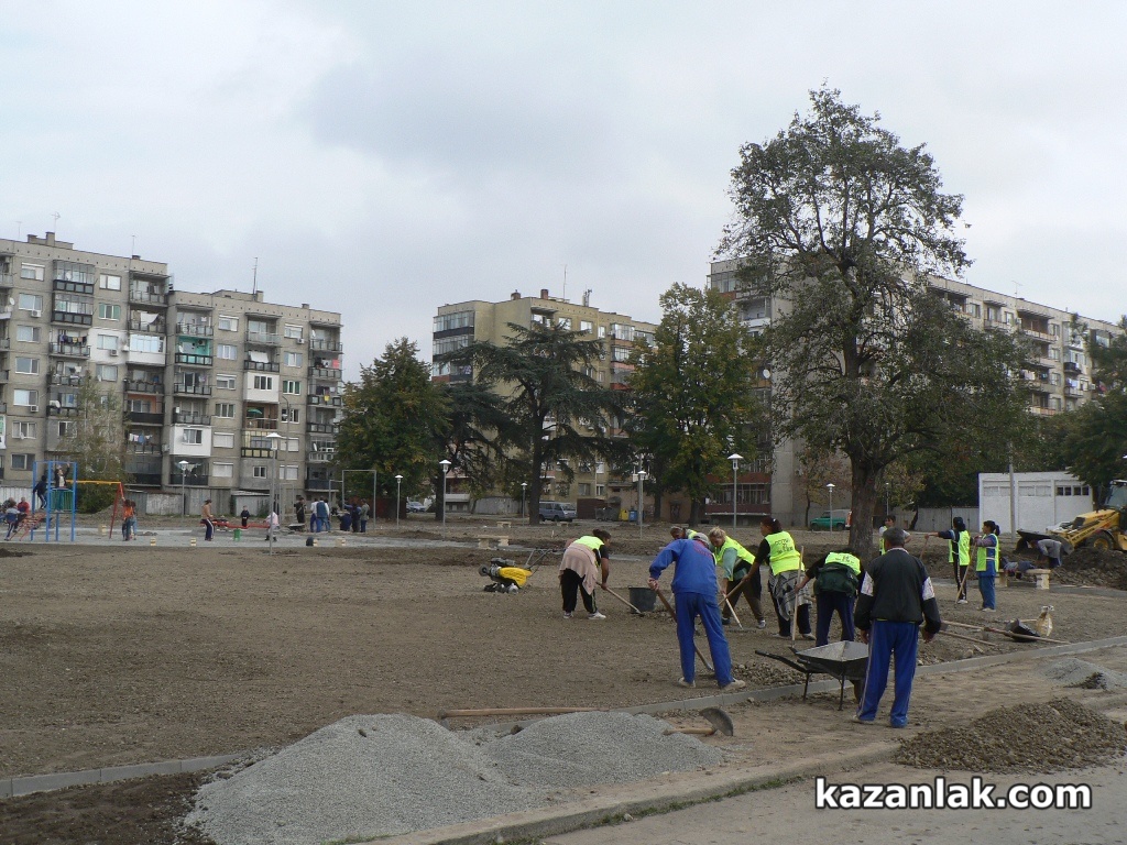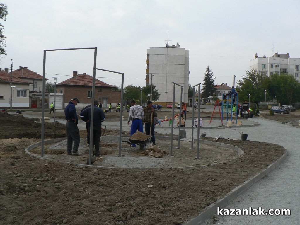 През почивните дни общинските служители продължават изграждането на новият парк в ж.к. Изток. Шефът на службата отговаряща за парка - ССТТБО Николай Чалъков заяви пред Kazanlak.Com, че прогнозата за сериозни валежи следващата седмица е причината да се работи през почивните дни. Днес бе засята голяма част от райграса в парка, работниците продължиха още изграждането на алеи, както и поставянето на нови храсти. Паркът се изгражда зад блок 111 и е на площ 4,4 декара. Предвидено е още засяване на иглолистни и широколистни дървета, както и зацветявне. Изградени са три площадки, като едната е за деца до 3 години, другата за деца до 7 години, а третата е за младежи. Поставени са вече голяма част от скамейките, като се планира общия им брой да бъде 15.