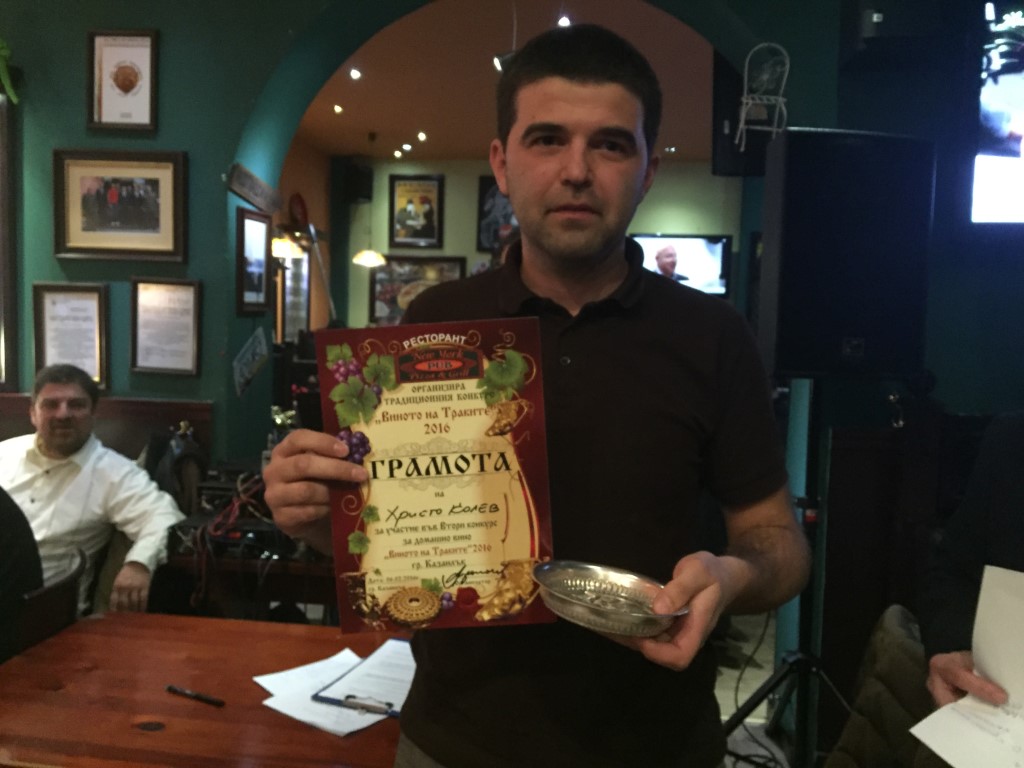 Сира от Странджа спечели и първата награда в конкурса – както по вкуса на журито, така и на публиката. Младият винопроизводител от Казанлък Христо Колев се явява за втора поредна година на конкурса, като миналата година взе сребърното отличие, а тази – златото и в двете категории. Гроздето е расло на висок склон в планината, като големите температурни разлики – много студено нощем и много горещо денем е позволило то да узрее и даде превъзходното вино, оценено като №1 в Казанлък тази година, обясни победителят Христо Колев.