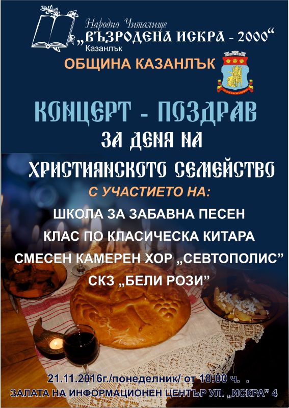 НЧ „Възродена Искра - 2000” ще представи концерт – поздрав за казанлъшката публика по повод Деня на Християнското семейство на 21 ноември от 18.00 часа в залата на Информационен център на ул. „Искра“ 4.