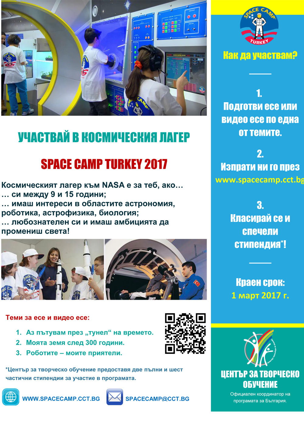 Възможностите на програма СПЕЙС КАМП ТУРЦИЯ 2017 бяха представени пред младите възпитаници на ПГ „Иван Хаджиенов”. Координаторите на проекта за България – Гергана Райжекова и Мартин Ангелов от Център за творческо обучение, разкриха част от предизвикателствата, които все още стоят пред космическите изследователи – на кои планети е вероятно да съществуват форми на живот, как да се облекчи тежката екипировка на астронавтите, какви растения виреят в открития космос… Решения на тези въпроси могат да намерят и участниците в детските тренировъчни лагери на NASA, обединени под логото на СПЕЙС КАМП.