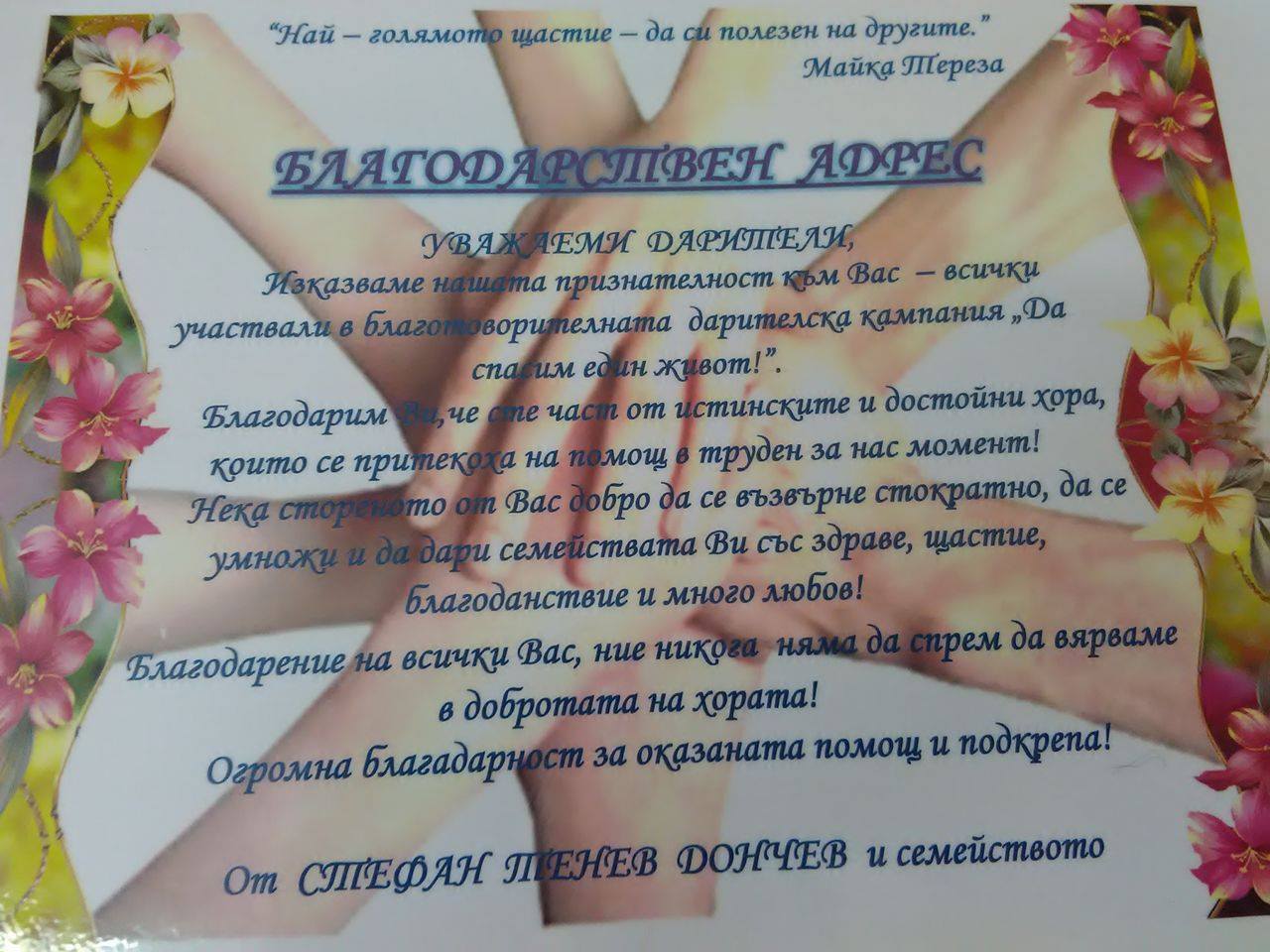 Г-н Антони Илиев пожела успешно възстановяване на Стефан и допълни: " Не е достатъчно да гледаме отстрани и да съжаляваме съдбите на хората. Ние трябва да се обединяваме и да помагаме с реални действия! Има много хора, но нека в този тежък момент покажем, че сме истински Човеци!" ПГЛПТ получи и благодарствен адрес от Стефан и семейството му за участието в кампанията!