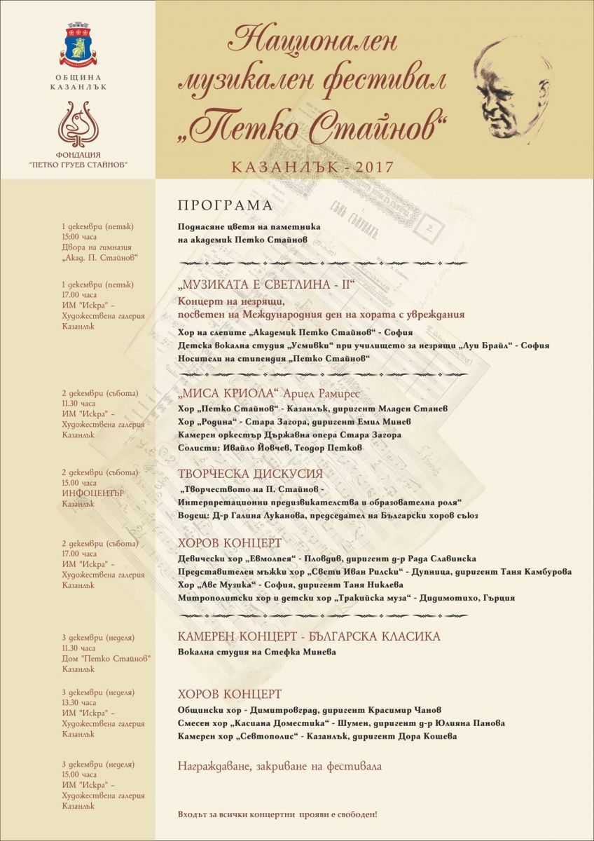 Музикалните дни за популяризиране на творчеството на Петко Стайнов и българската музика се провеждат за 16-та поредна година, организирани от Община Казанлък и фондация „Петко Стайнов“.