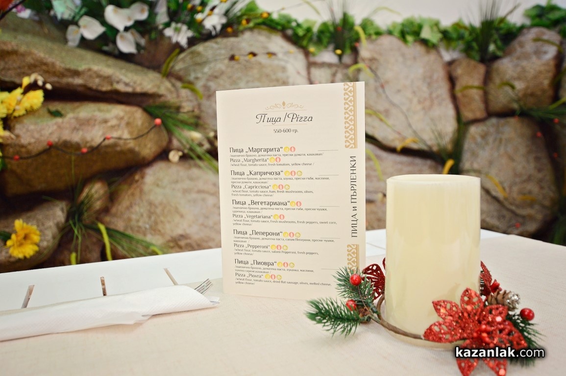 Италианският стандарт на тънката 33 сантиметрова пица, изпечена на пещ на дърва е другото предизвикателство, с което екипът на „Палас“ ще привлече като магнит любителите на пиците от Казанлък, още от първия ден. А за децата – детското пица меню включва и коледен подарък-изненада. Разбира се, както си му е реда, пиците на „Палас“ ще може да поръчате и за вкъщи с доставка.
