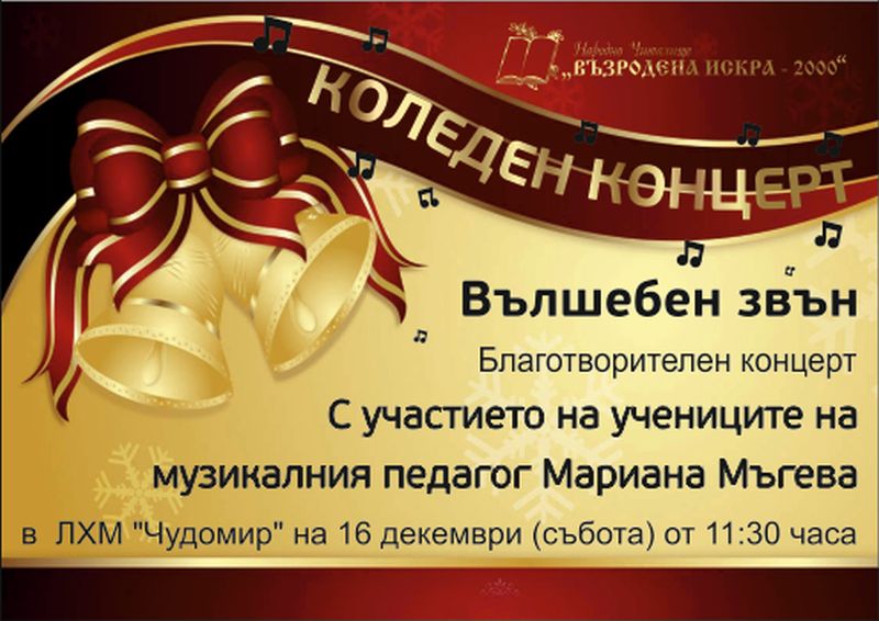 Възпитаниците на госпожа Мариана Мъгева, от Школа по пиано и Школа по забавна песен към НЧ „Възродена Искра–2000”, ще поздравят казанлъчани в събота, на 16 декември. Те ще представят своята коледна продукция „Вълшебен звън” в ЛХМ „Чудомир” от 11:30 часа.