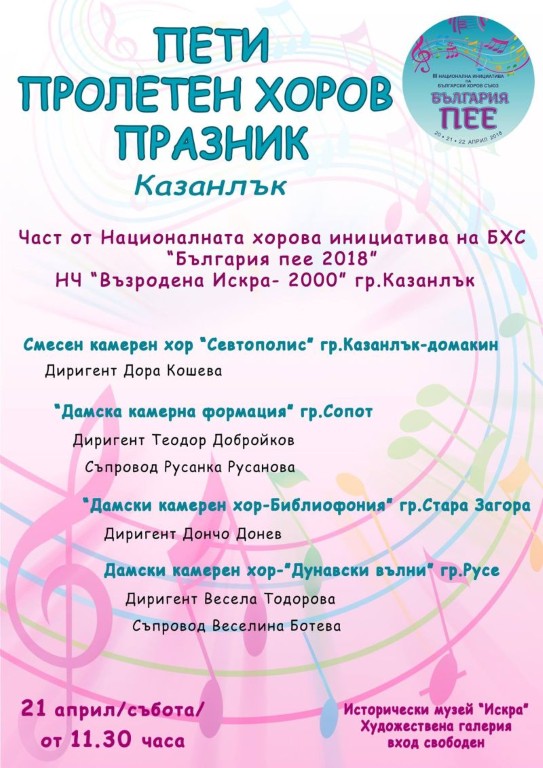 Казанлък, като град с традиции в хоровото изкуство ще предостави на своята публика възможността да се запознае и докосне до творчеството и професионализма на хорови школи от страната.