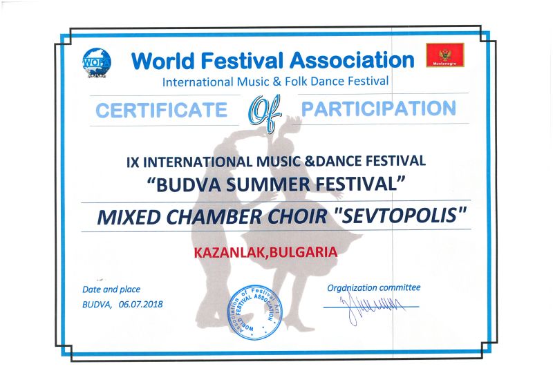 Смесен камерен хор „Севтополис“, с диригент Дора Кошева при НЧ „Възродена Искра – 2000“, се завърна от участие в деветото издание на „Budva Summer Festival“. Фестивалът е под егидата на World Festival Association и се проведе на 5 и 6 юли в красивия и живописен черногорски курорт Будва. В него взеха участие 10 певчески, театрални, танцови и мажоретни състави и духов оркестър от различни страни – Русия, Турция, Украйна, Унгария, Словакия и България.
