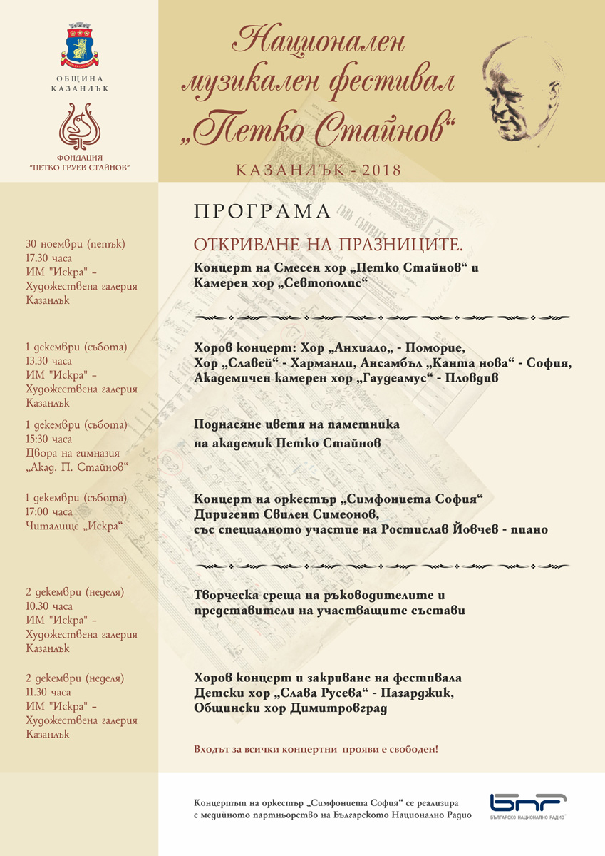 Едно от най-важните събития в съботния фестивален ден ще бъде поднасянето на цветя на паметника на композитора, който се намира в гимназия „Акад. Петко Стайнов”.
