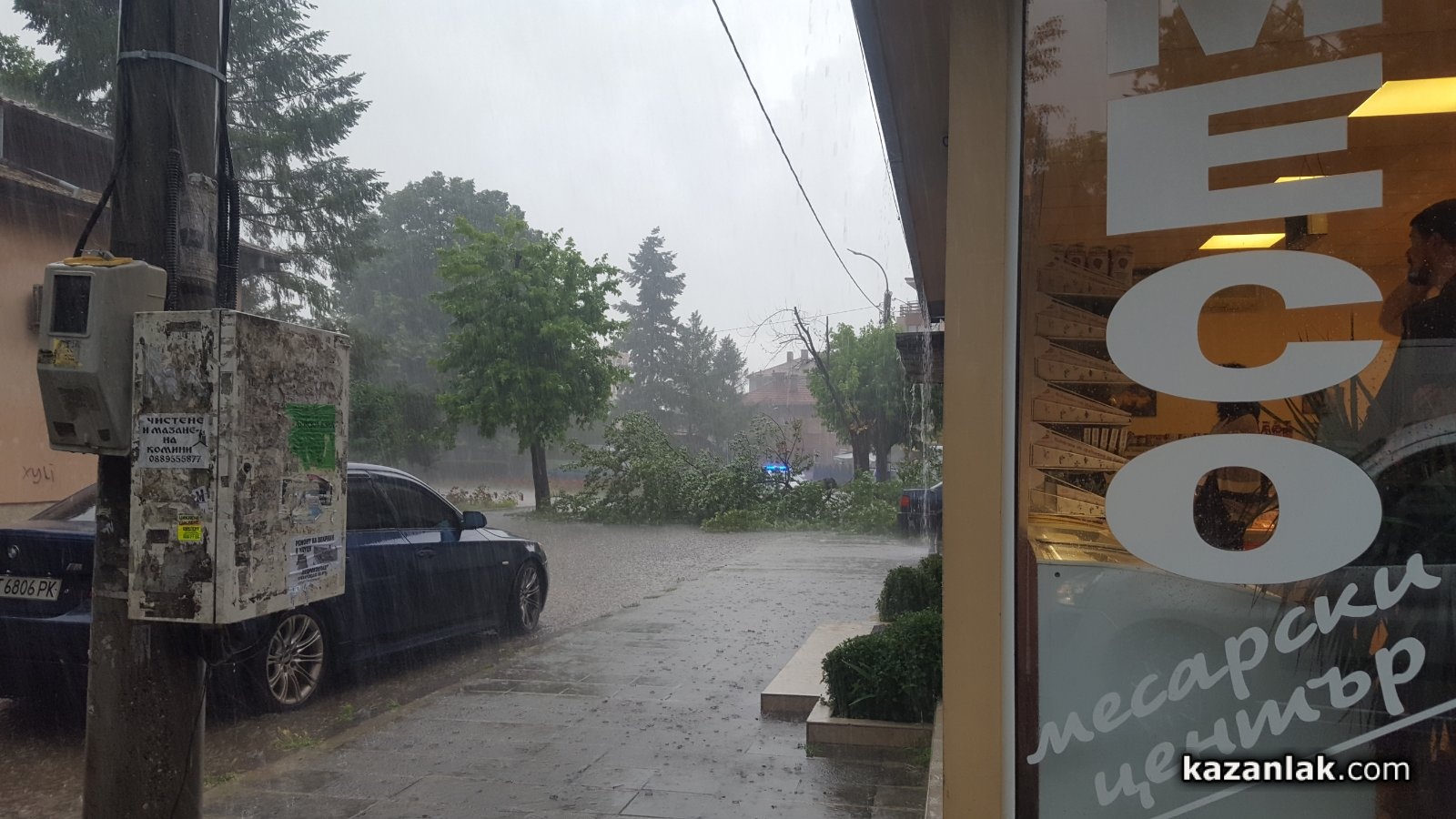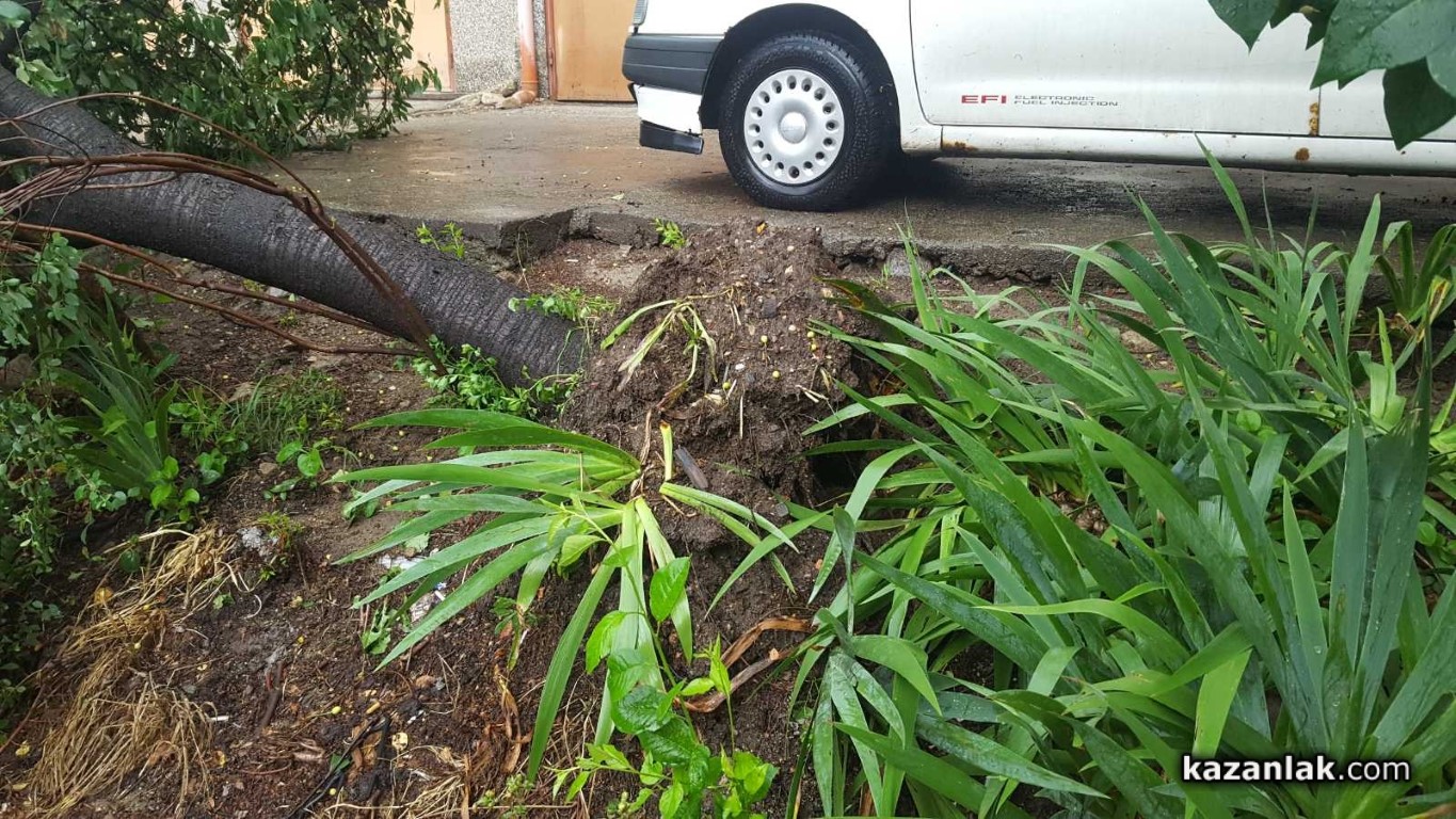Силната буря събори дърво на платното за движение, което препречва пътя на улица "Христо Ботев" до паметника на Георги Кирков, посока Поликлиника. Поради силния дъжд премахването му за момента е невъзможно.