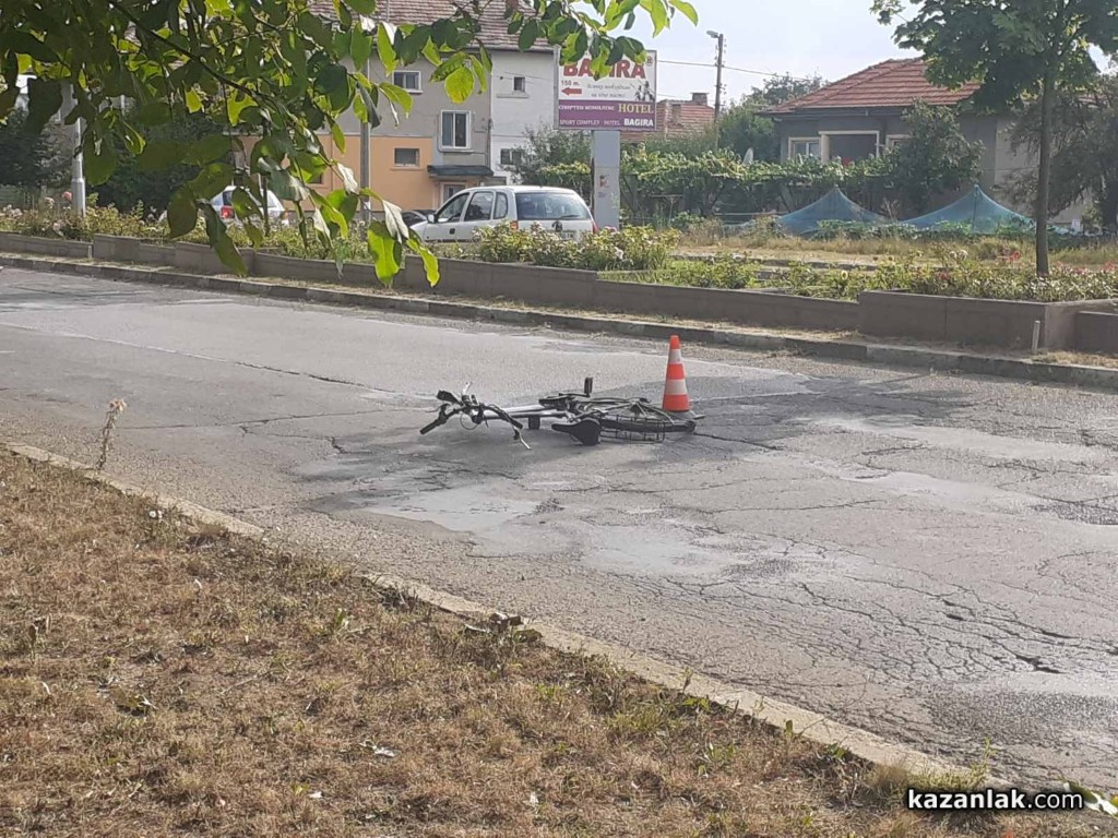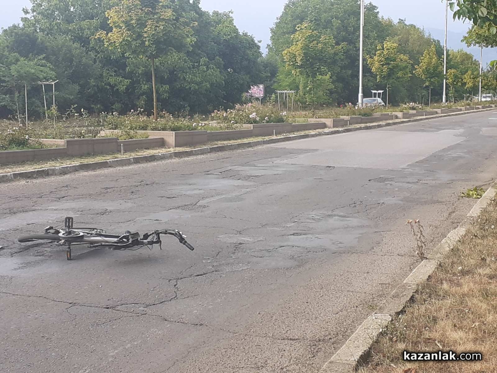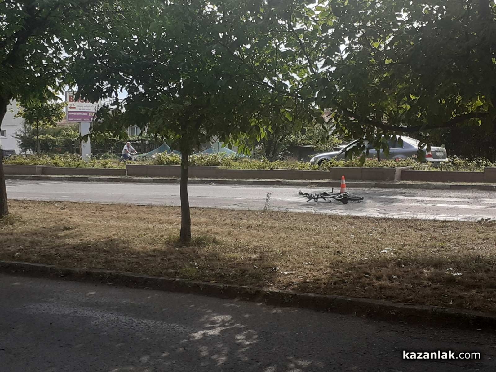 Шофьорът, 20-годишен казанлъчанин, с автомобил "Мg Zr", се движи в посока север, когато не пропуска преминаващия по пешеходната пътека 65-годишен велосипедист и го удря. Пострадалият мъж е откаран в Спешното. За момента няма информация за неговото състояние. Колелото е буквално премазано, а от удара е изхвърчала и едната му гума.