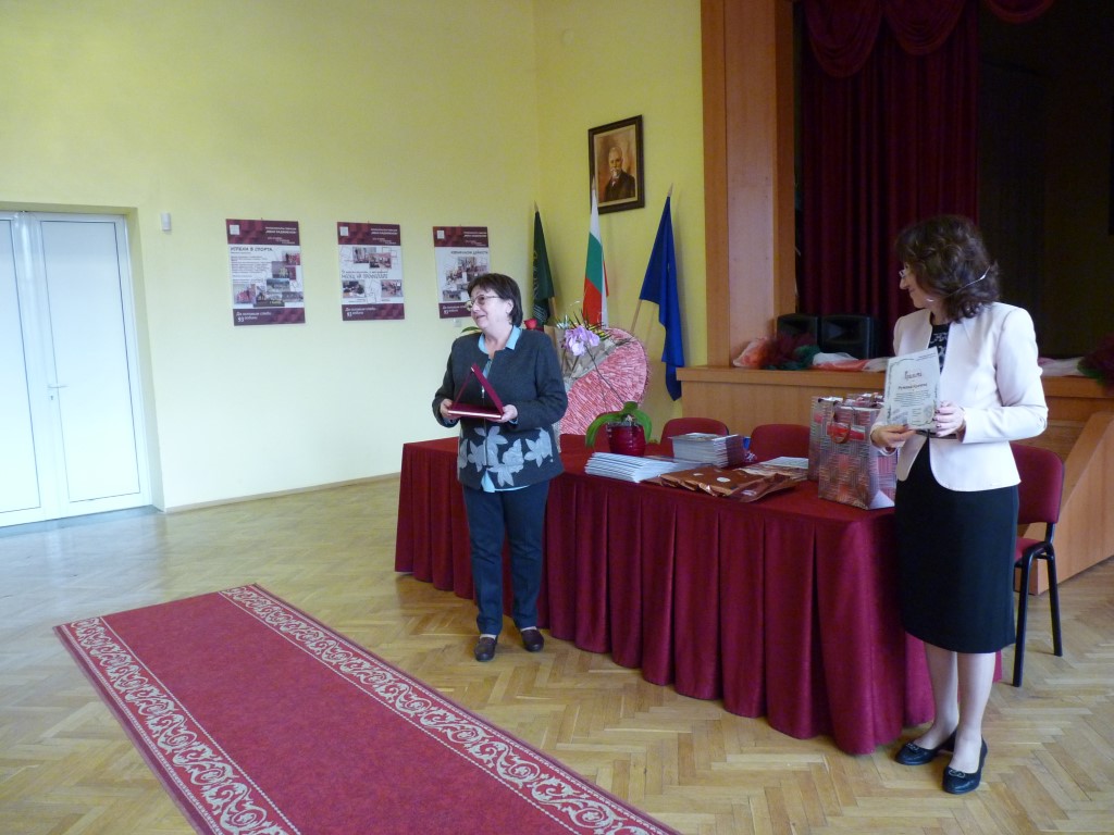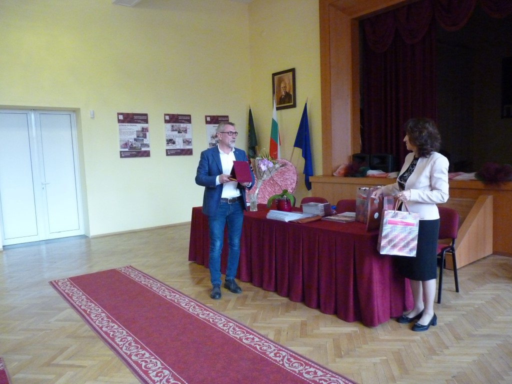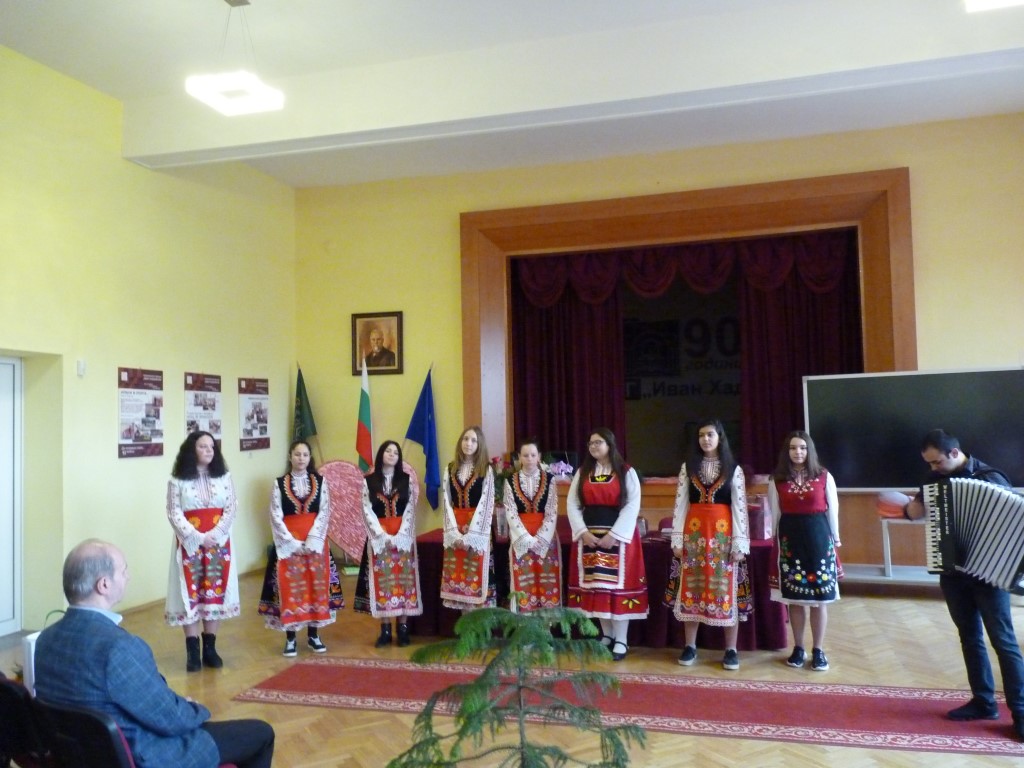 В краткото тържествено отбелязване на празника взе участие сформираната едва преди няколко месеца музикална група на училището. В емоционалното си слово госпожо Демирева, под чието ръководство преминават последните рождени дни на гимназията, сподели благодарности към всички, които с финансова и морална подкрепа участват в училищния живот. Пет плакета и грамоти бяха връчени на новите почетни хаджиеновци! С решение на педагогическия съвет при ПГ „Иван Хаджиенов“ високото отличие получават ръководителите на пет от фирмите партньори на училището - Владимир Спасов - „М+С Хидравлик“ АД, Танчо Михайлов - „Гуала Клоужърс България“ АД , Николай Спиров - „ЮМТ“ АД, Румяна Крачева - „Крес-Д“ ЕООД, Любомир Дянков - „Капрони“ АД! След дългогогодишния директор на гимназията Христо Гъдев, изпълнителният директор на „Арсенал“ АД Николай Ибушев и ръководител направление „Образование и квалификация” в „Арсенал” АД Владимир Чучумишев отличието - четвърто поред отива при професионалисти и приятели на училището, които в годините доказват, че милеят за бъдещето на нашите възпитаници.