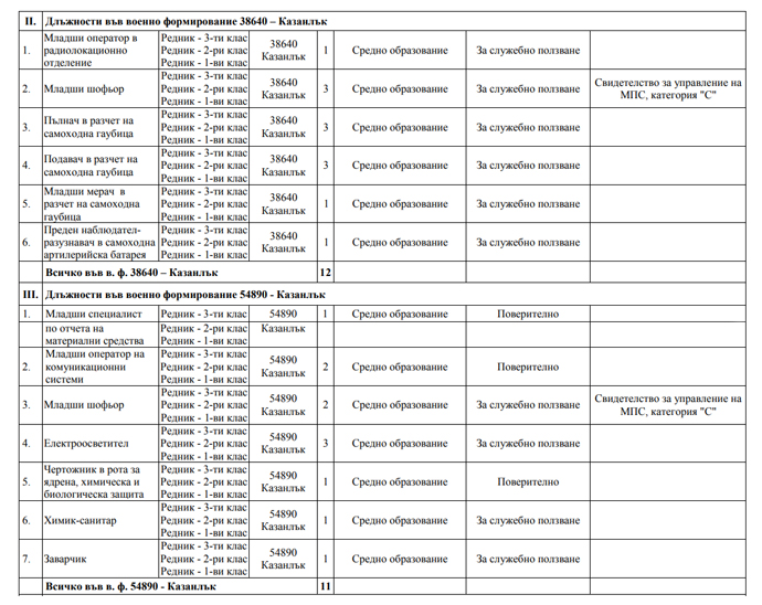 Обявените длъжности са във формирования на Сухопътните войски, дислоцирани в гарнизоните Стара Загора, Ямбол, Плевен, Карлово, Казанлък, Благоевград, Враца, Смолян, Свобода и Мусачево. В Града на розите обявените вакантни позиции са 23 на брой.