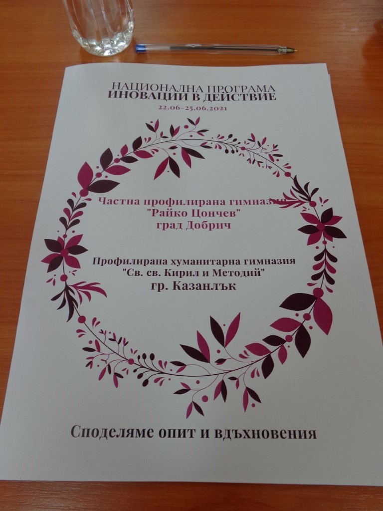 В периода 22.06.2021-25.06.2021г. учители и ученици от Профилирана хуманитарна гимназия „Св. Св. Кирил и Методий“ гостуваха на Частна профилирана гимназия „Райко Цончев“, град Добрич, по Национална програма „Иновации в действие“. Цел на посещението бе обмен на иновации и добри практики в образователната среда.