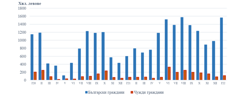 Приходите от нощувки през януари 2022 г. в област Стара Загора нарастват със 148.6% в сравнение с януари 2021 г. и достигат 1 681.9 хил. лв., като 1 563.7 хил. лв. са от български граждани, а 118.2 хил. лв. - от чужди граждани (фиг.1).