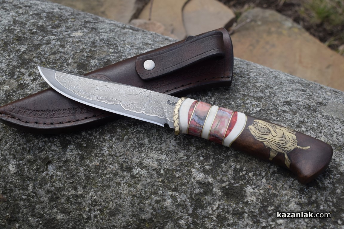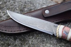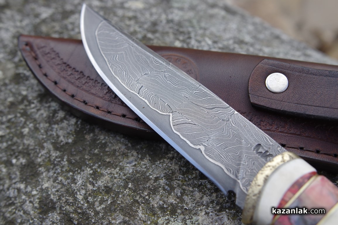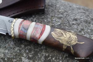 Майсторът ни показа своя личен нож, за който сподели, че е използвал мозайкова дамаска от стомана, която се кове 4 дни. В различните дни се изковавало само острието. Сложната инкрустация от метал и дърво на дръжката изисквала допълнително време. Към нея той прибавя и кътници от мамут. По принцип изработката на един нож може да варира от 2-3 дни до месец, според него.