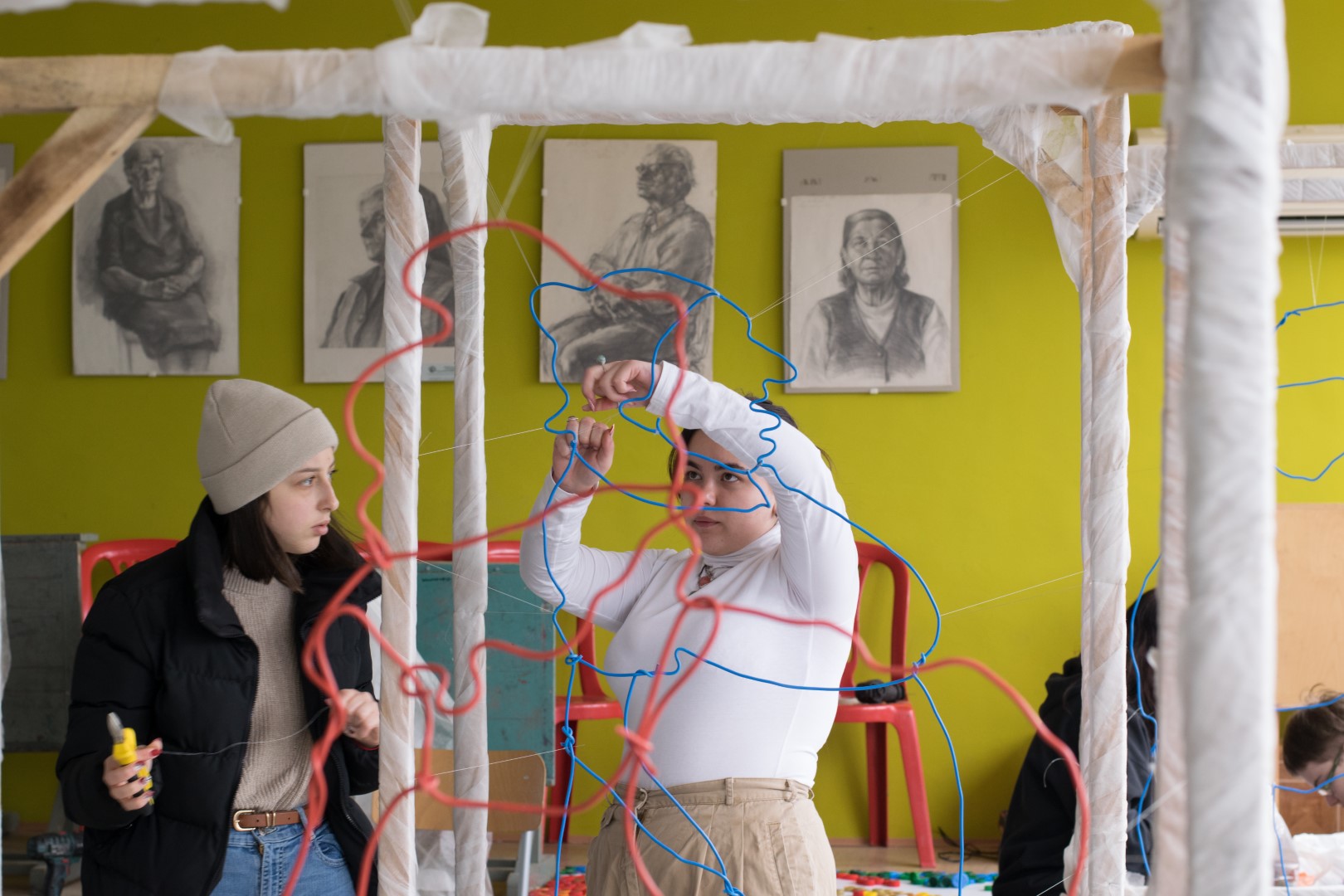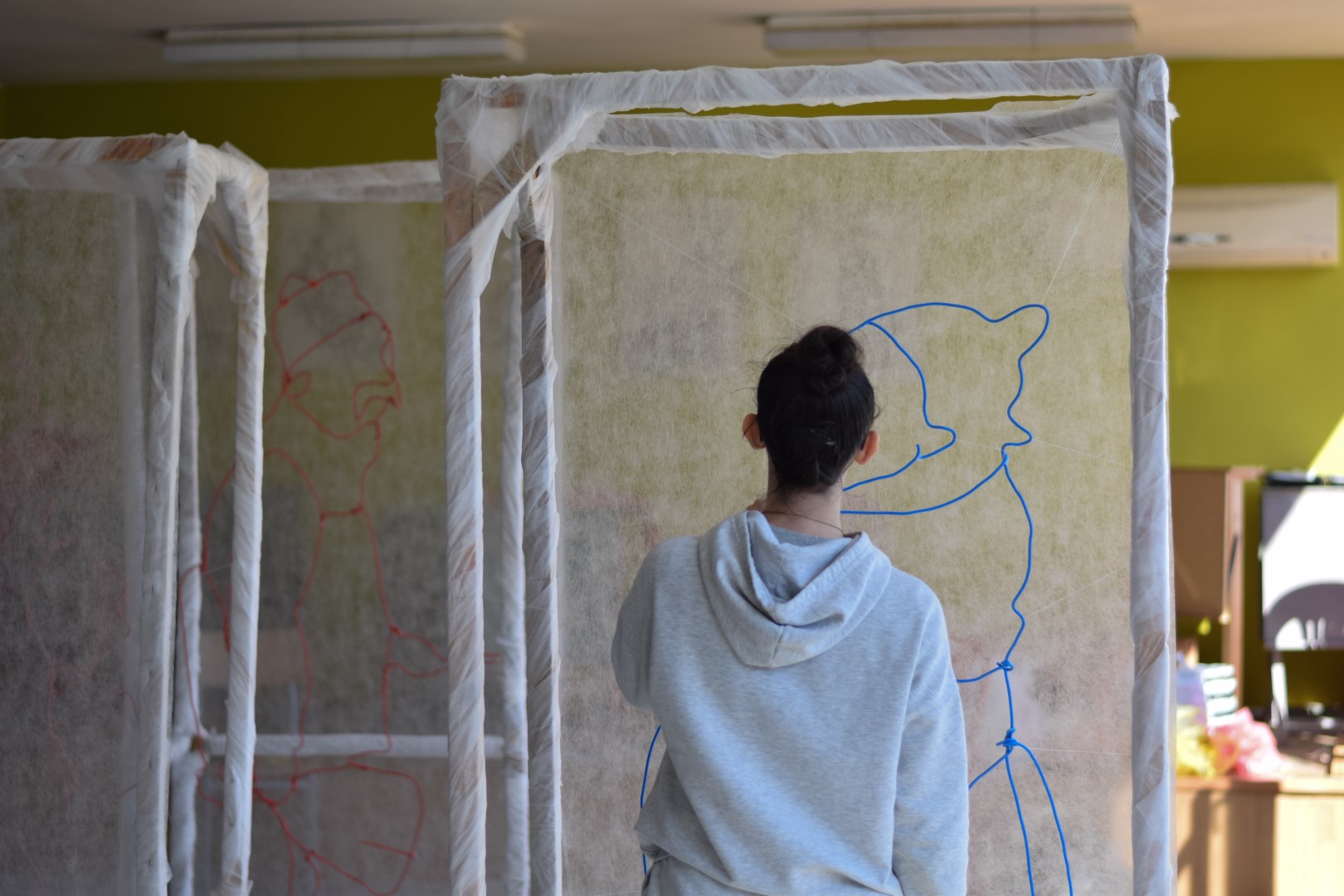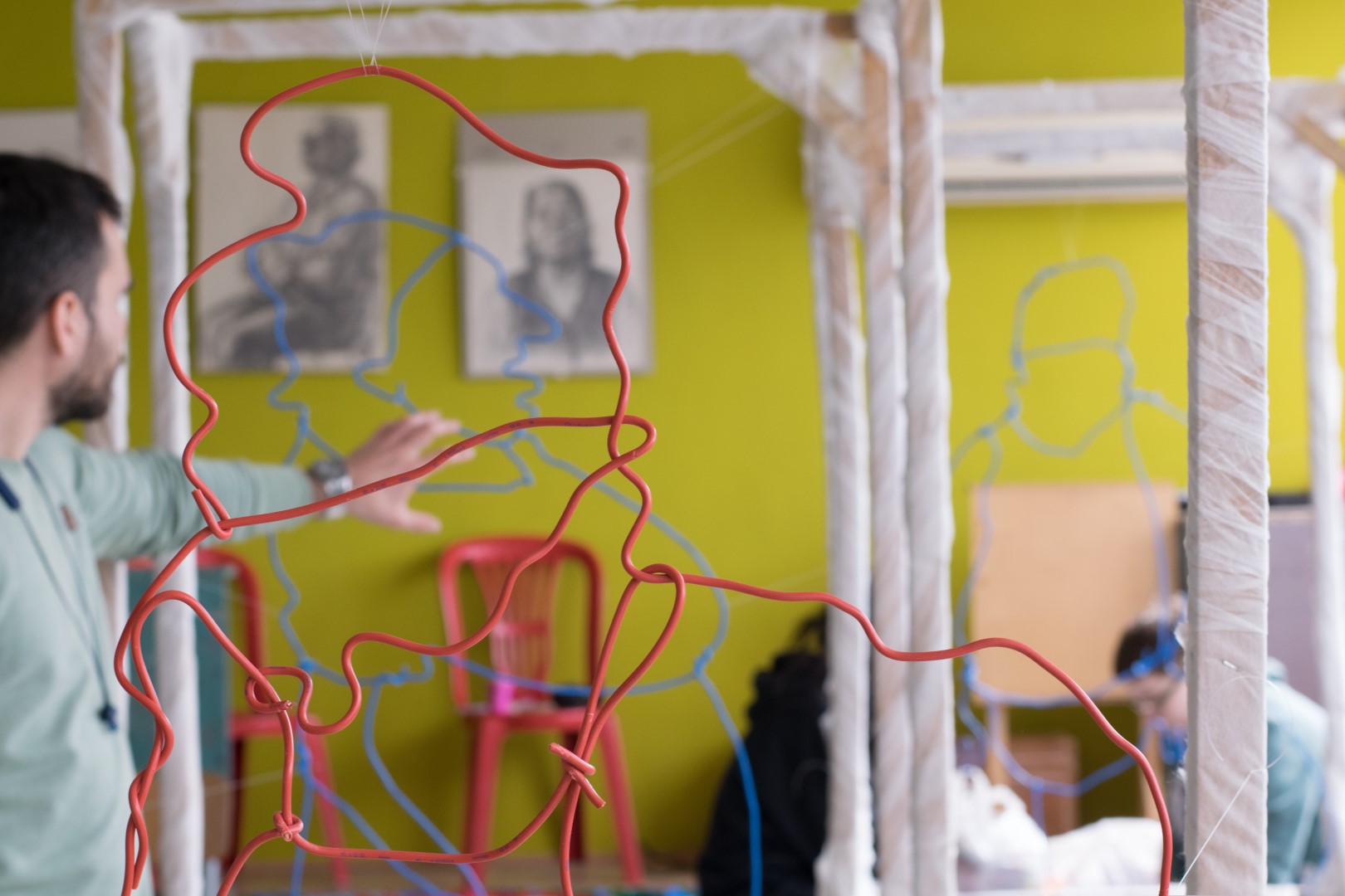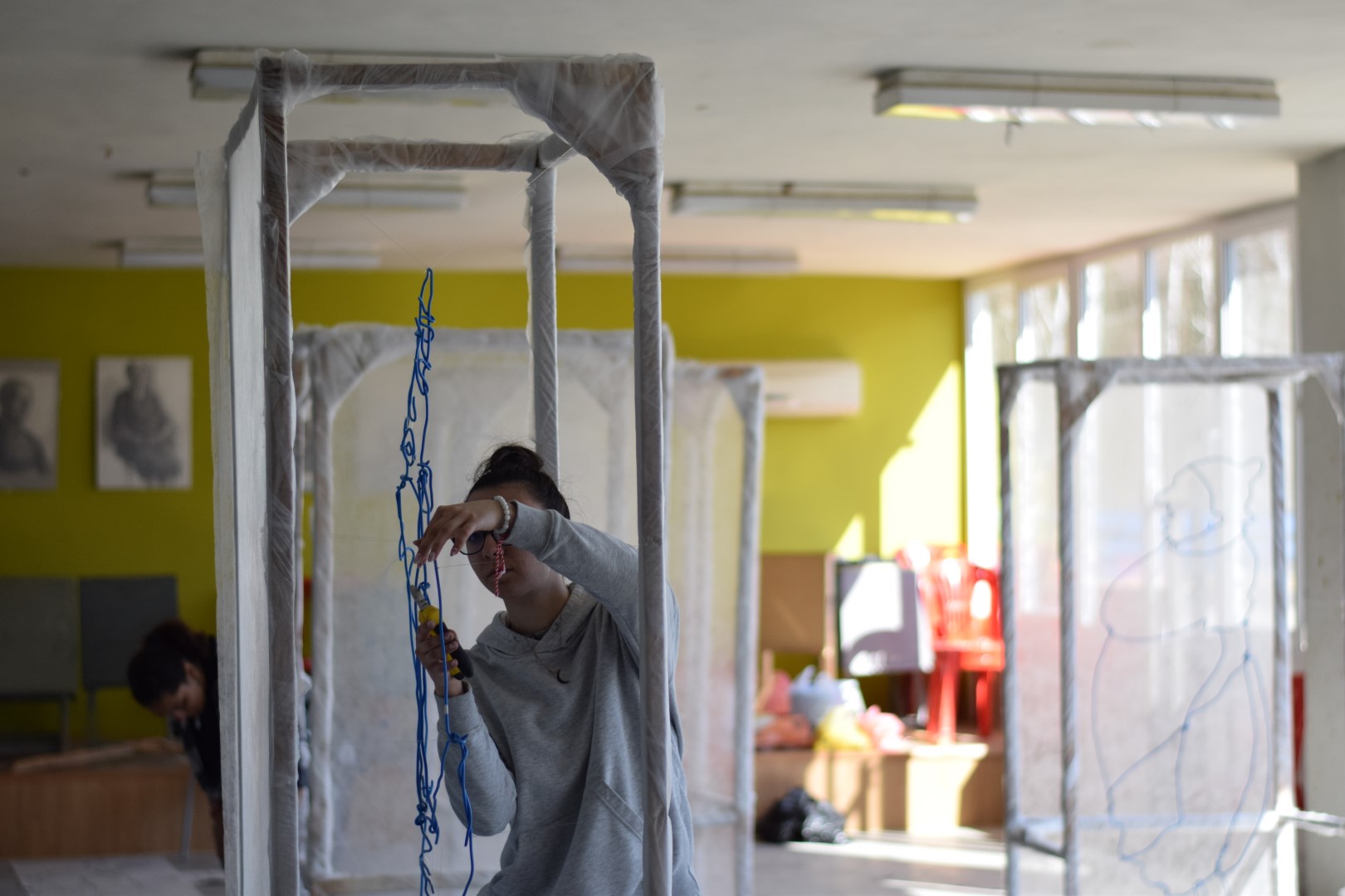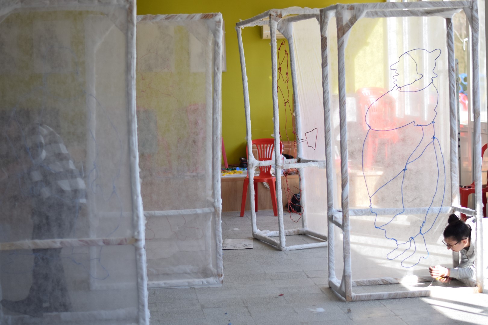 (Елеонора): Тази година решихме да направим нещо по–различно, използвайки рисунки в пространството. В работите на Чудомир най-ценното е изказа и рисунъка му, чрез който той обхваща „Нашенците“ . Вдъхновени от това решихме да създадем рисунки в пространството чрез телове за да може пред нас да оживеят тези нашенци, но по един по-различен и прекрасен начин. Всяка година се опитваме да направим различни инсталации, да има съчетания между съвременното и Чудомир. Идеята е по този начин, неговото творчество да продължава да оживява сред нас.