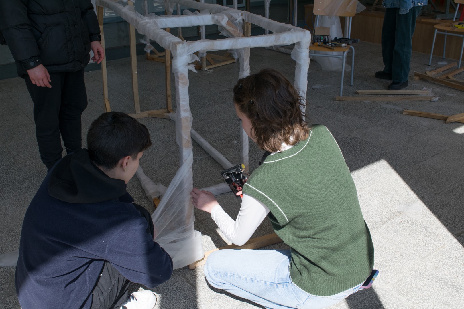 (Никола): Учениците, които участваха бяха от 10-ти, 11-ти и някои от 12-ти клас, но е трудно да конкретизирам, понеже се включваха много деца. Използвахме едно общо пространство, което имаме в училището, където се включваха различни ученици,помагайки в процеса на изработка.