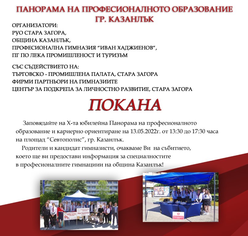 Община Казанлък ще проведе X-а Областна панорама на професионалното образование и кариерното ориентиране на 13 май 2022 г., петък, на площад "Севтополис" с начален час 13,30 ч. В нея ще вземат участие всички училища от общината с професионално обучение, а именно: