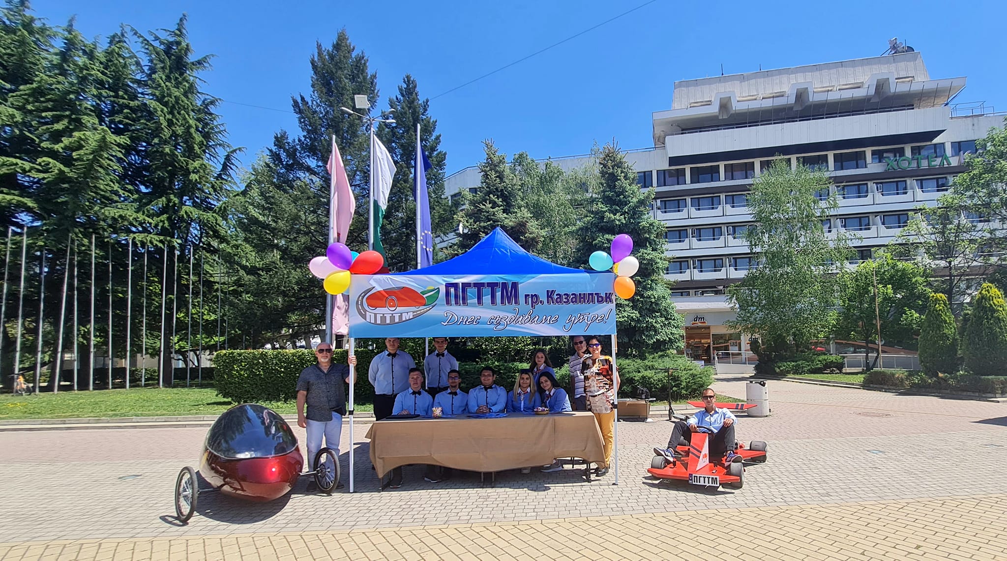 Под жаркото слънце на петък 13-ти ученици и преподаватели от Професионална гимназия по транспорт и мениджмънт презентираха специалностите и професиите на гимназията в рамките на Панорамата на професионалното образование и кариерно ориентиране в Община Казанлък.