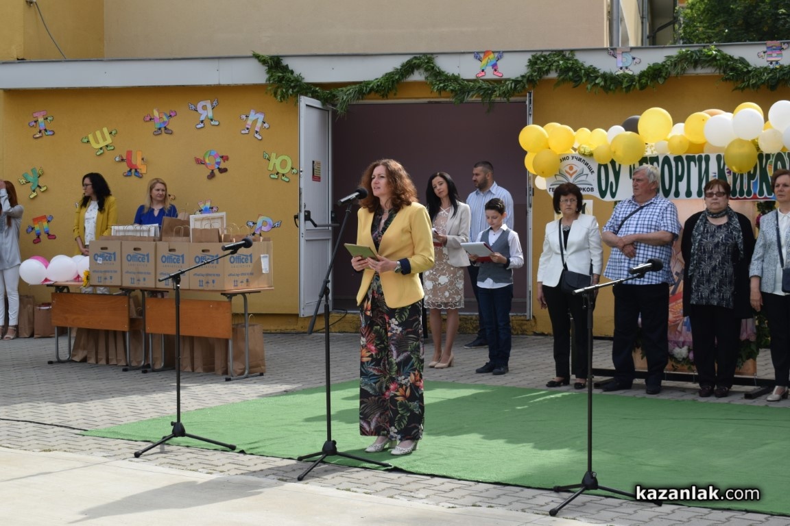 Директорът на ОУ „Георги Кирков“ Сребра Касева отбеляза, че няма човек, който да не се вълнува на 24 май и допълни: „Искам да поздравя и да благодаря най- напред на кмета на Община Казанлък - Галина Стоянова за това, че тя прави всичко по силите си образованието в Община Казанлък да бъде на ниво . Няма училище или детска градина, която да не привлича със своята светлина , привлекателност и топлина. Всички сгради са като нашата . Благодаря, че миналата година когато имахме нужда от съдействие поради протеклия покрив на училището тя ни подаде ръка да го оправим , а тази година ще имаме възможност да ремонтираме и спортния двор. От името на целия колектив, благодаря и на нашия обществен съвет с председател Кристина Манева за подкрепата , както и на нашите мъдри учители, дали живота си за училището. Благодаря , че ни уважихте и винаги сте добре дошли , а нашите млади колеги могат винаги да разчитат на вашата подкрепа. Благодаря и на учителите , които днес са тук и работят в ОУ „Георги Кирков“, че се справихте с лекота и професионализъм с трудностите. Родители, тук са вашите деца, знаещи и можещи , поздравявам ви с днешния празник, бъдете спокойни, те са в добри ръцете."