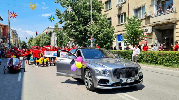 Сиво „Бентли“, управлявано от красива жена, дефилира на шествието на Празника на розата. То беше част от представянето на ПГ по транспорт и транспортен мениджмънт. Лъскавото возило, заедно с учениците и преподавателите, представи в едно минало, настояще и бъдеще.
