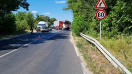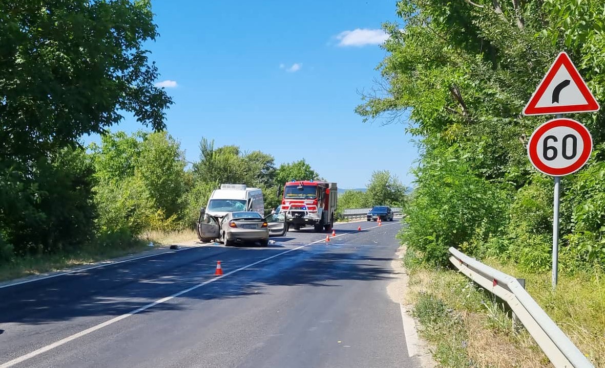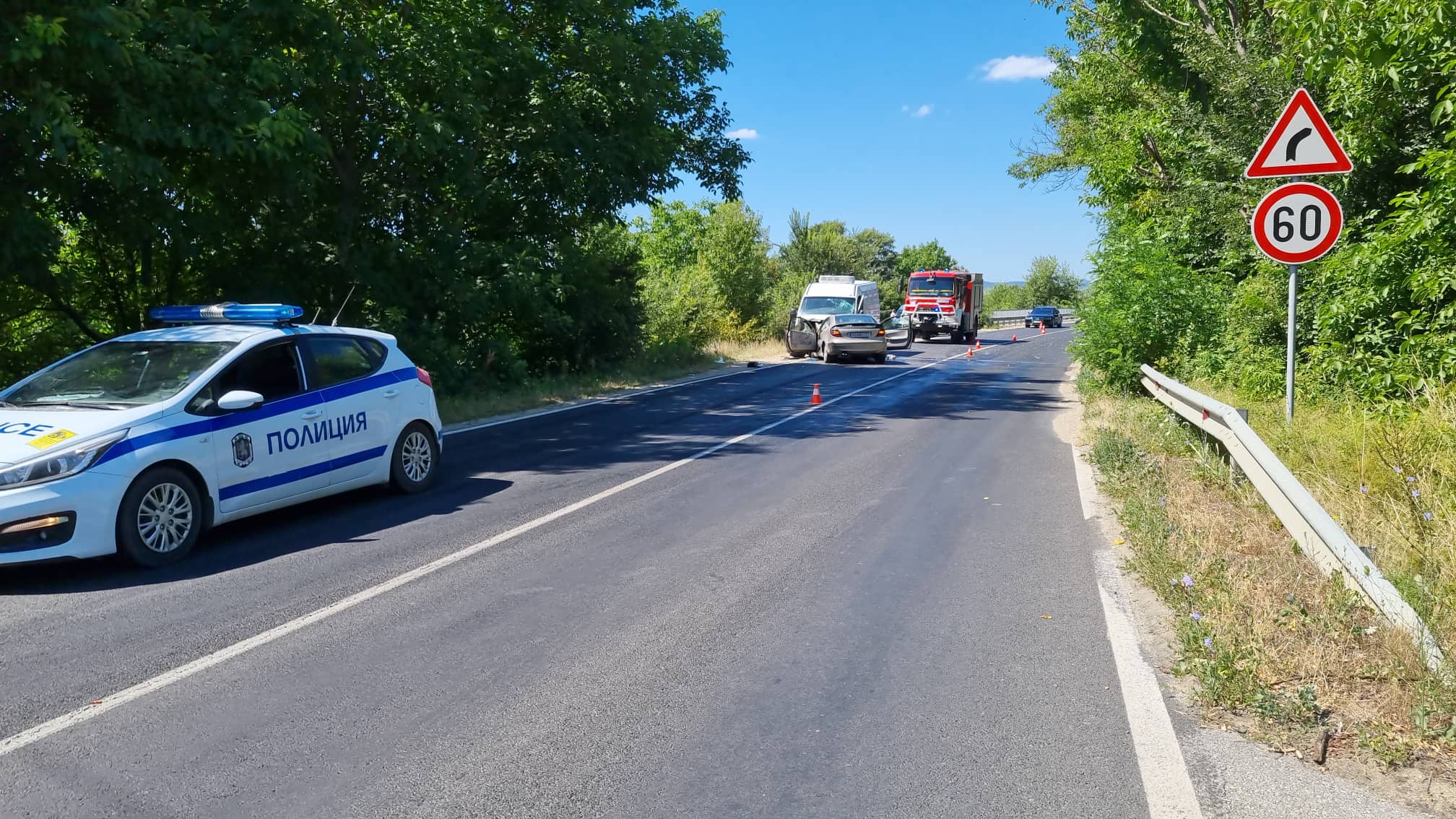Лек автомобил "Мерцедес" и микробус са се блъснали челно. Причините все още се изясняват. На място е загинал 54-годишен мъж, който шофирал Мерцедеса, а жената пътувала с него е пострадала, но е без опасност за живота. Шофьорът на буса е с травма на крака, като е откаран в Спешното за лечение.