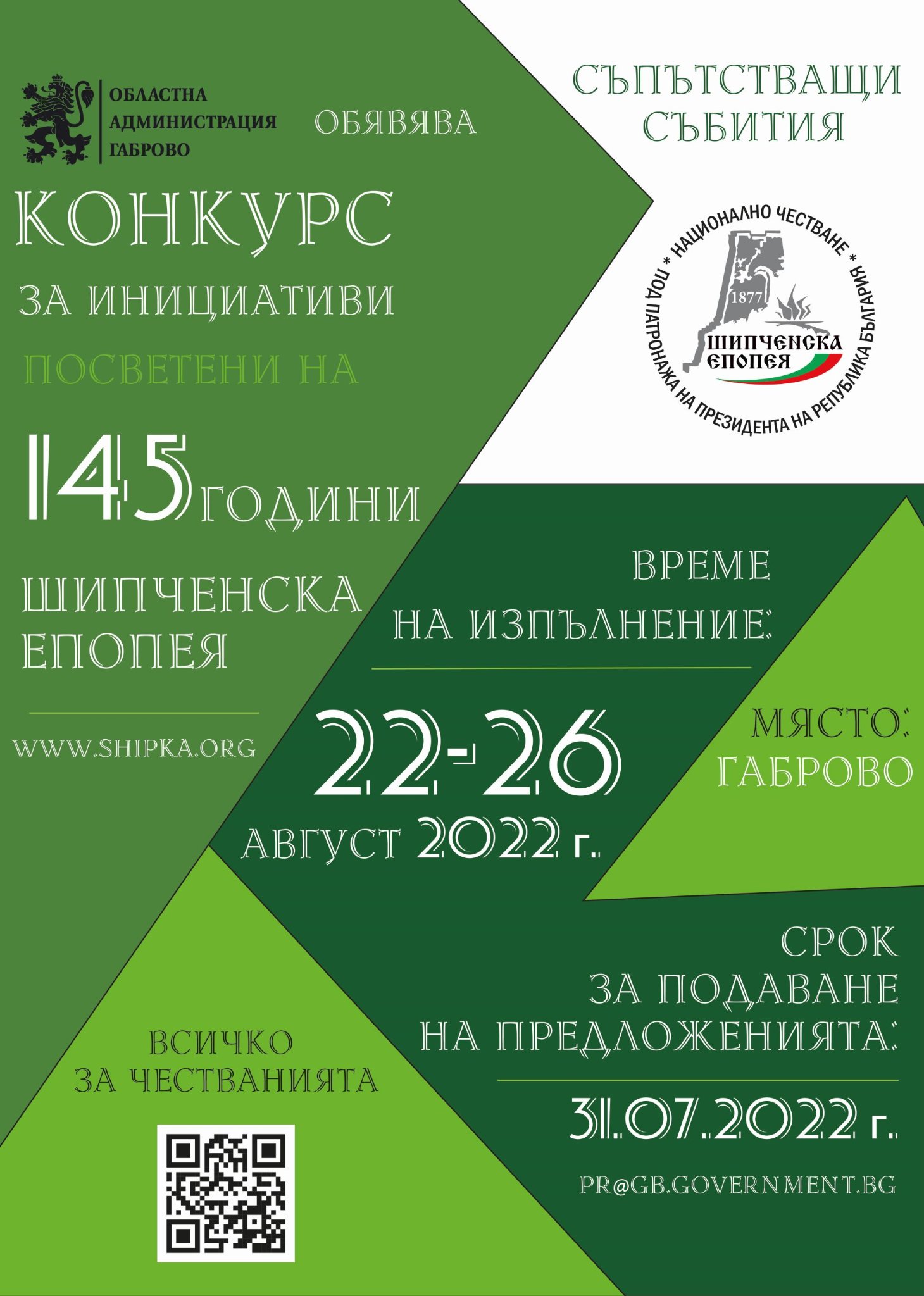 Тази година Областна администрация Габрово обяви конкурс за инициативи за съпътстващи събития в рамките на Национално честване „Шипченска епопея“. Целта е да се провокира интерес към историческото събитие по интересен и различен начин в градска среда и да се провокира участието на общността към организацията му. Организаторите очакват предложения за алтернативни локации за инициативите и желание на творчески и неправителствени организации за изява. Повече за условията вижте тук.