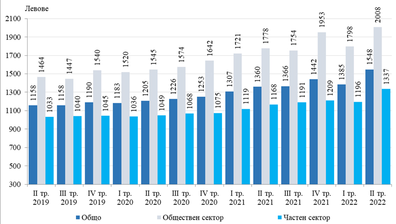 Спрямо същия период на предходната година през второто тримесечие на 2022 г. средната месечна работна заплата в областта нараства с 13.8%, като в обществения сектор нарастването е с 12.9%, а в частния - с 14.5%.
