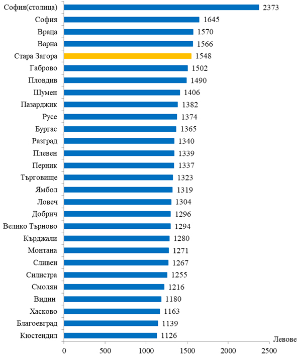 Средната брутна месечна заплата в област Стара Загора за април 2022 г. е 1 548 лв., за май - 1 541 лв. и за юни - 1 556 лева.