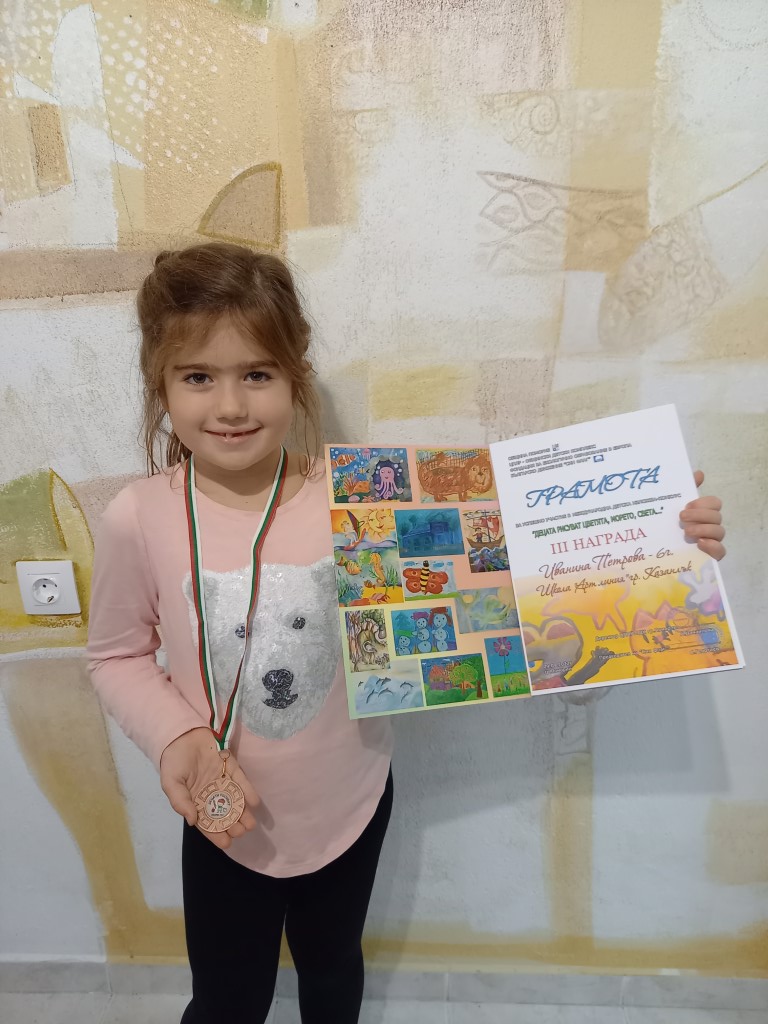 С две трети места в двете възрастови групи са отличени: 6-годишната Иванина Петрова и Петър Маджаров на 8 години. Малките художници от школа „Арт линия” спечелиха и пет поощрителни награди, ето и кои са те: Ивет Кацарова на 5 години, 6-годишната Стела Атанасова, Александър Гавраилов на 8 години,Александра Пенкова – на 9 години и 10-годишната Версавия Иванова.