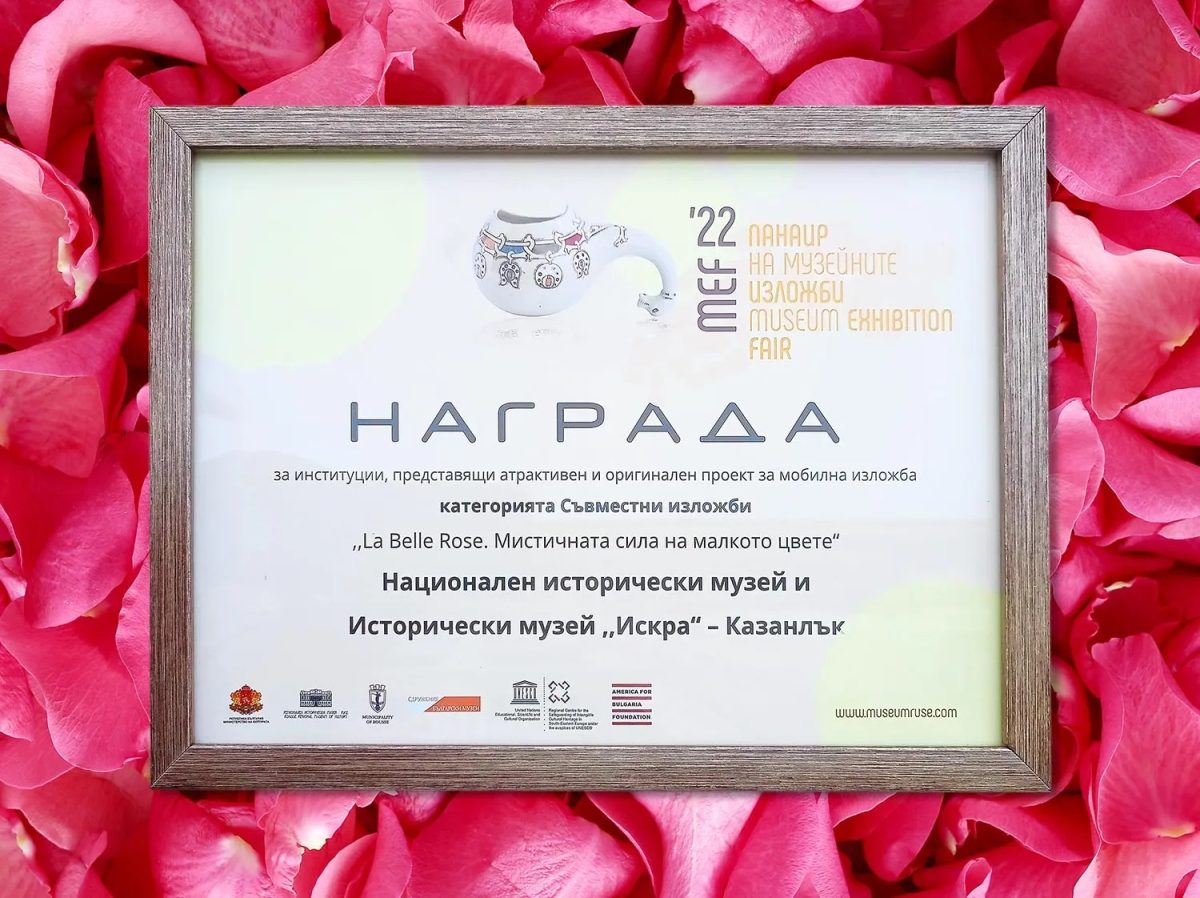 Наградата за институции, представящи атрактивен и оригинален проект, спечелиха Национален исторически музей и Исторически музей ,,Искра“ – Казанлък. Наградата е за мобилна изложба, в категорията Съвместни изложби – ,,La Belle Rose. Мистичната сила на малкото цвете", съобщиха от НИМ.