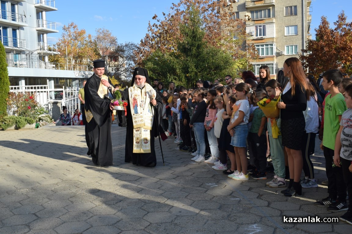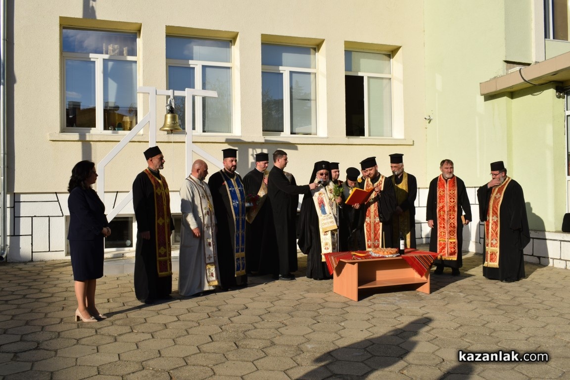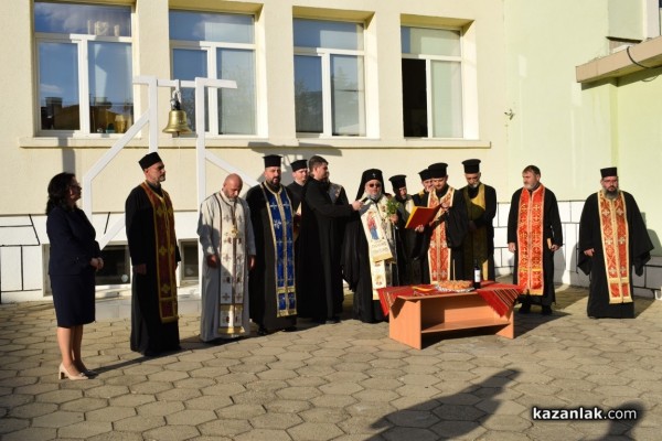 Митрополит Киприан, възпитаник на училището, придружен от духовници, отслужи тържествен водосвет при откриването на камбаната в двора на училището.