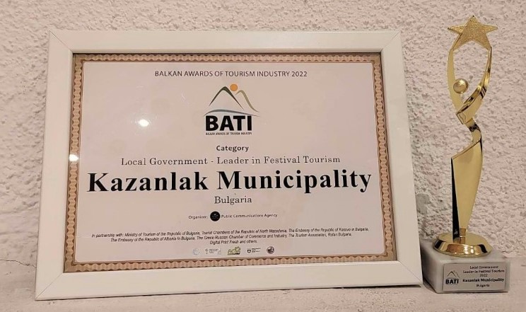 Община Казанлък бе отличена за лидер във Фестивалния туризъм на осмото издание на годишните награди Balkan Awards of Tourism Industry 2022 миналата вечер в София. На официалната церемония бяха отличени значимите постижения на институции и компании, които активно работят в най-важната сфера за развитието на Балканския полуостров. Организаторите от ВИП Комюникейшън ЕООД за поредна година награждават общини, хотелиери, туристически агенции и мениджъри в туризма от различни държави на Балканите, с което превръщат София в столица на полуострова.
