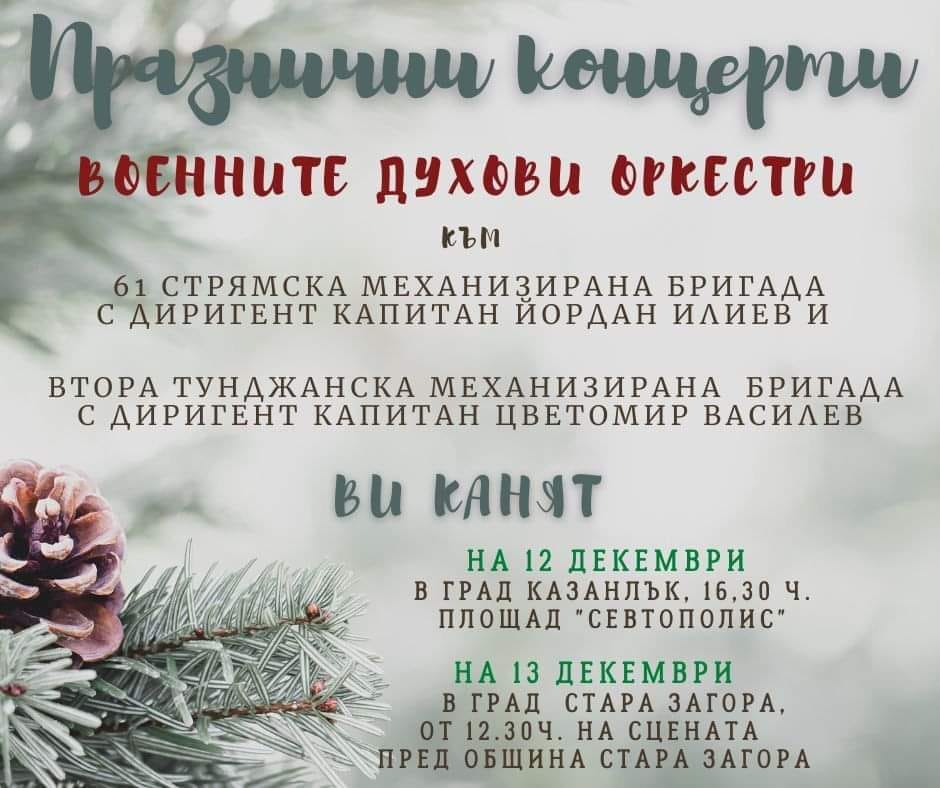 Идният понеделник /12 декември/ на площад „Севтополис“, от 16:30 часа ще се състои празничен концерт на Военните духови оркестри към 61 Стрямска механизирана бригада с диригент Капитан Йордан Илиев и Втора Тунджанска механизирана бригада с диригент Капитан Цветомир Василев.