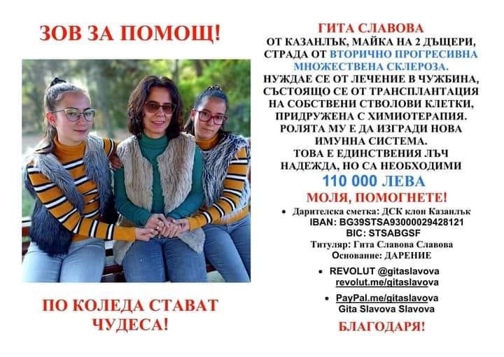 Гита е от Казанлък, майка на две момичета и част от екипа на СНЦ „Бъдеще за децата”. От 17 години тя се бори с диагнозата Множествената склероза, но състоянието ѝ безвъзвратно се влошава. Към днешна дата казанлъчанката се затруднява дори да върви самостоятелно, както и да използва пълноценно ръцете си. Лъч надежда ѝ дава Московската болница с трансплантация на собствени стволови клетки, придружена с химиотерапия. Необходимите средства за лечението са 110 000 лв., като сумата е непосилна за семейството на Гита.