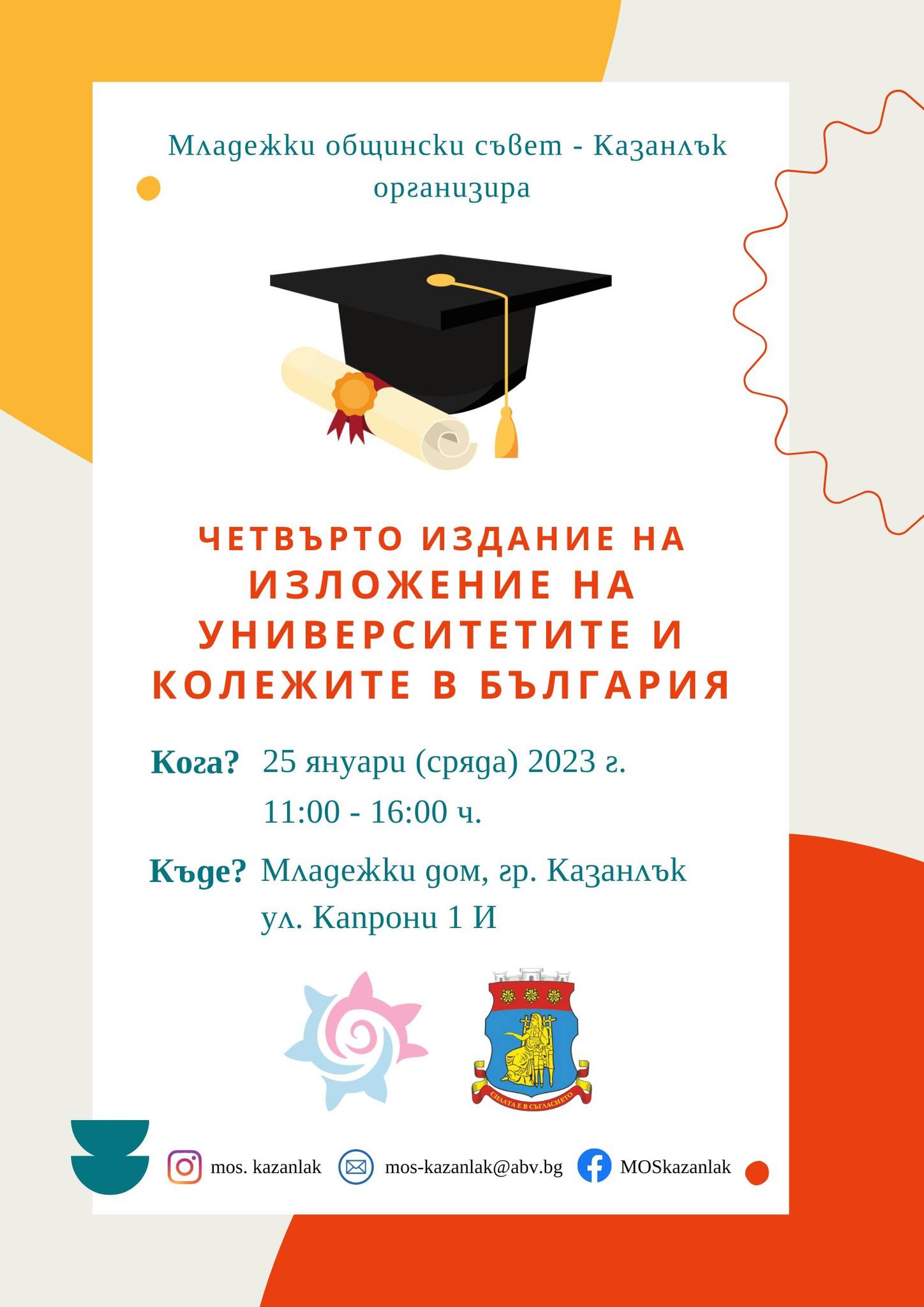 На 25 януари, сряда, от 11:00 до 16:00 часа в сградата на Младежки дом, ул. Капрони 1 И ще се проведе четвъртото издание на "Изложение на университетите и колежите в България" в гр. Казанлък!