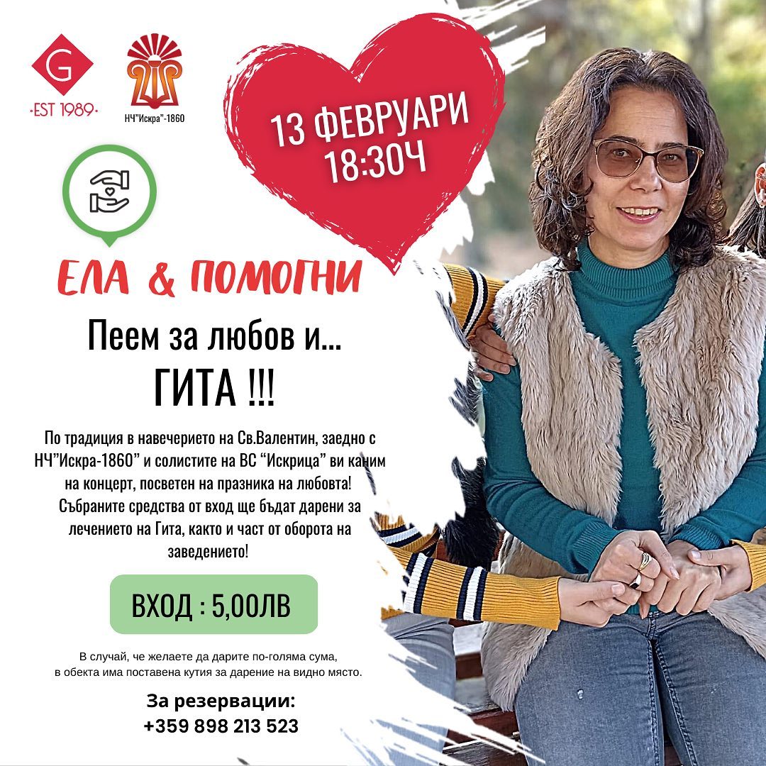 В навечерието на Свети Валентин, 13 февруари, от 18:30 часа в бар „Градини“ ще се проведе благотворителен концерт в подкрепа на Гита Славова лечението ѝ от Множествена склероза. Първоначално събитието бе определено да подкрепи каузата на 13-годишната Мариела Димитрова, нуждаеща се от спешна операция в Германия, сумата за която бе събрана, стана ясно вчера вчера.