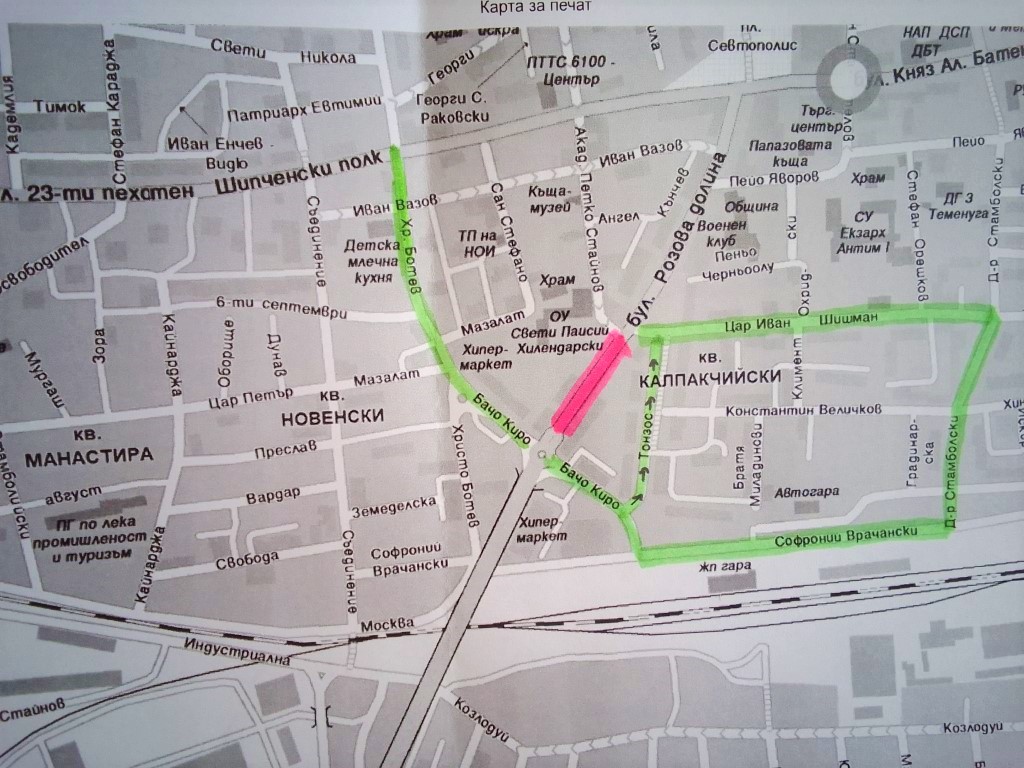 Въвежда се временен режим на движение на ППС по обходните улици: ул.„Цар Иван Шишман“, ул.„Д-р Стамболски“, ул.„Софроний Врачански“, ул.„Бачо Киро“, ул.„Тонзос“ към съществуващата улична мрежа в града.