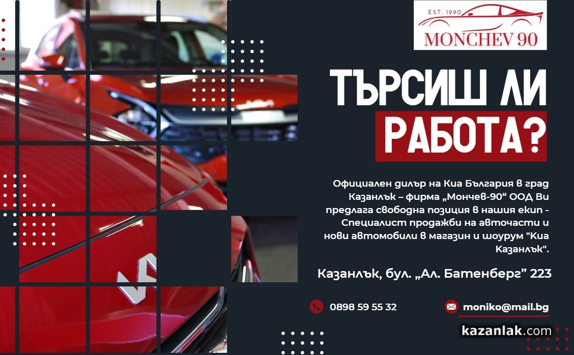 Официален дилър на Киа България в град Казанлък – фирма „Мончев-90“ ООД Ви предлага свободна позиция в нашия екип - Специалист продажби на авточасти и нови автомобили в магазин и шоурум "Kиа Kазанлък".