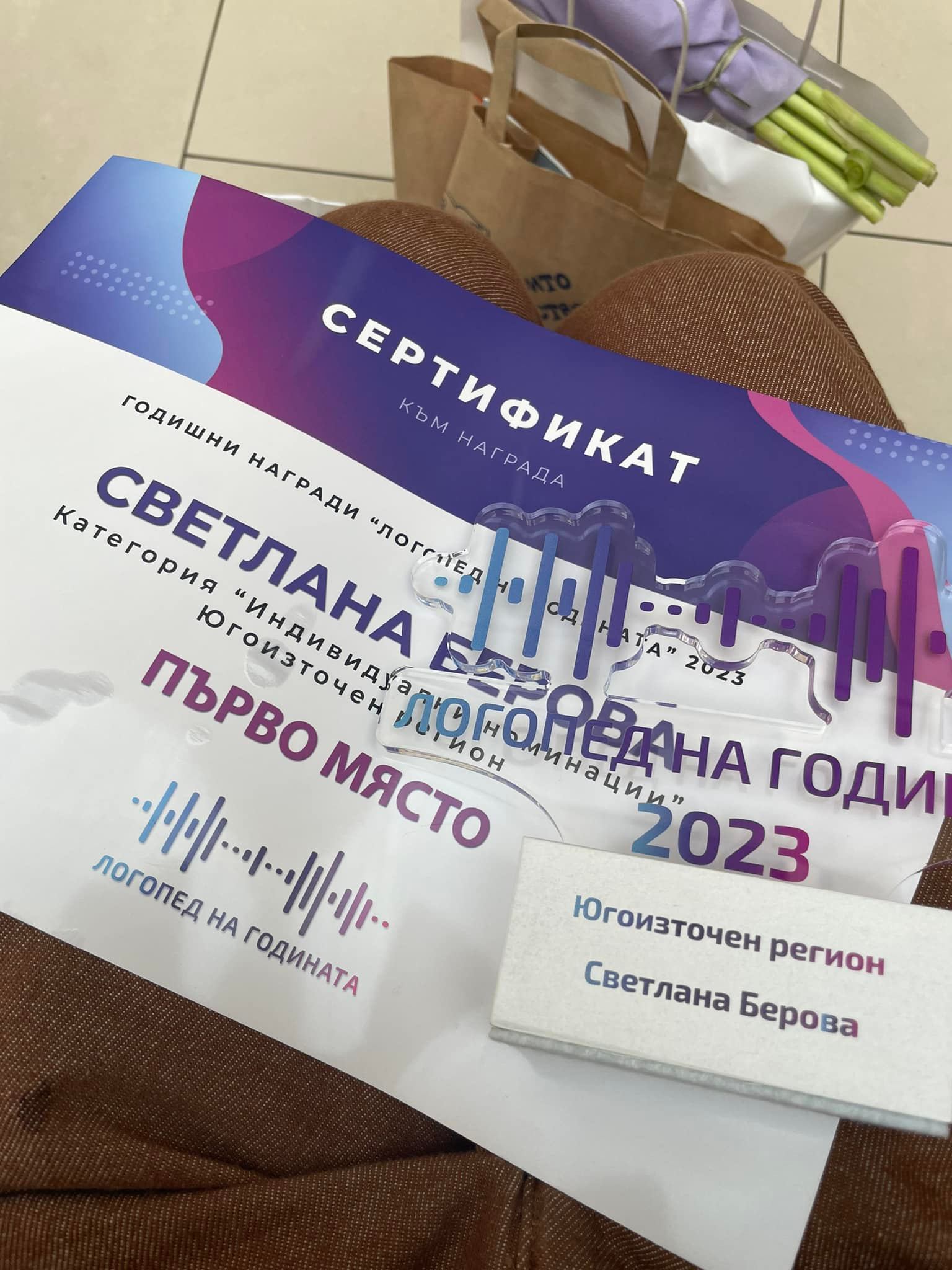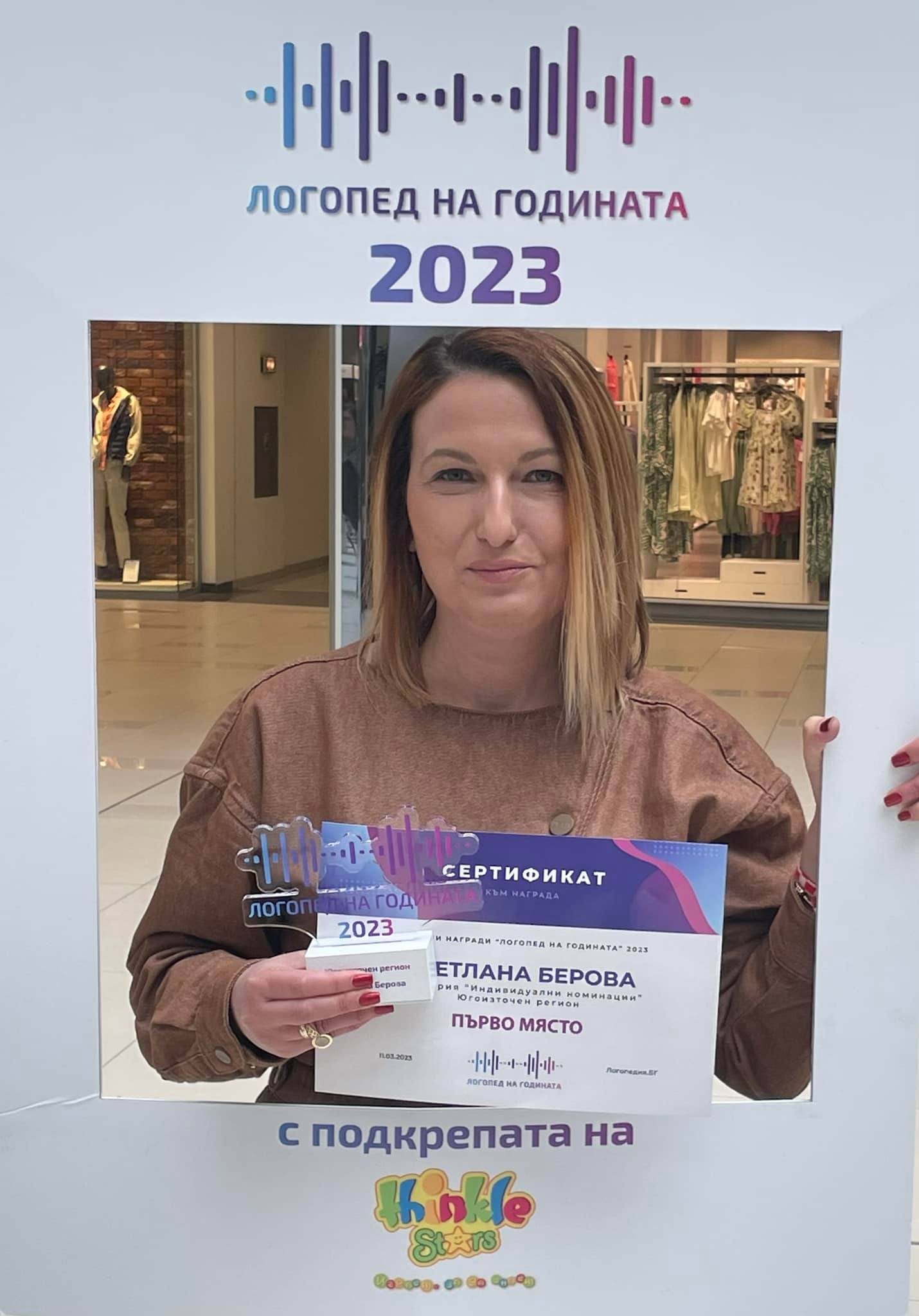 За „Логопед на годината” бе обявена Светлана Берова на официална церемония в София. Призът бе връчен от организаторите - платформата „Логопедия.БГ“, на национално събитие. Наградите, учредени по райони, са признание и отражение за положение труд, себеотдаване и развитие на логопедите като специалисти, както и на приноса им в развитието на професията.